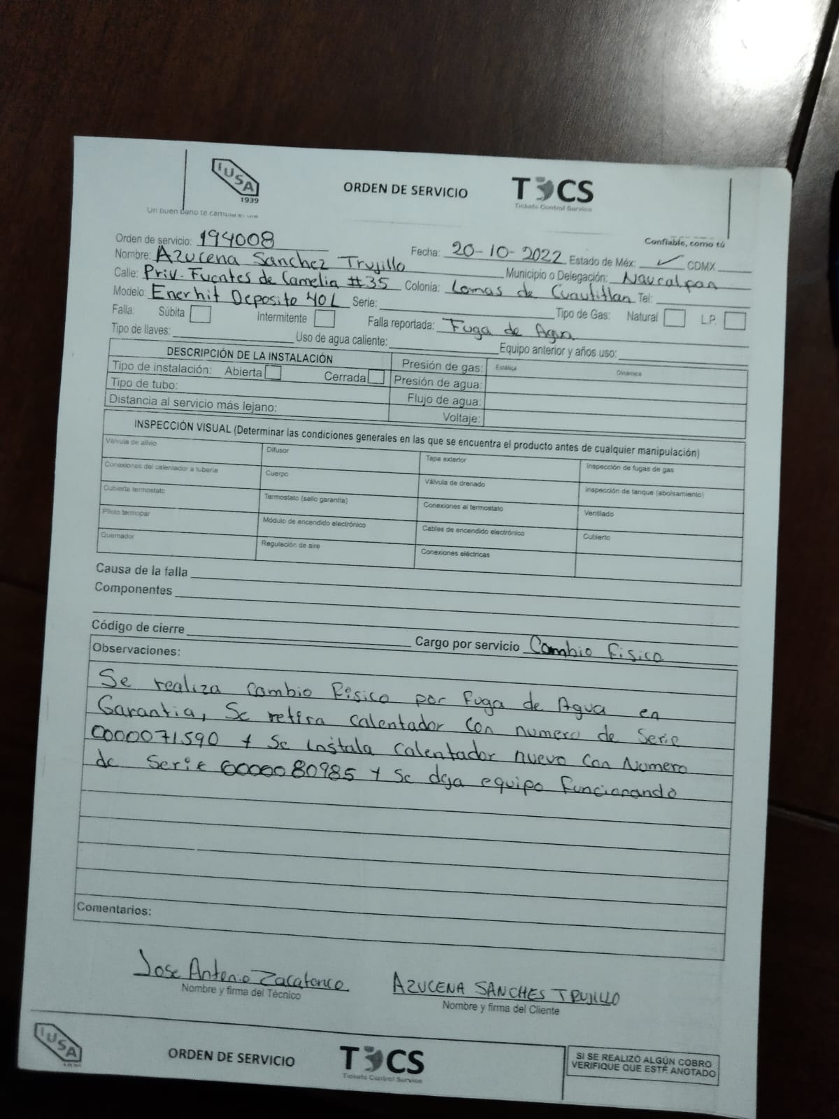 | Usuario see comunica indicando que el equipo presenta un pequeño goteo y el equipo esta oxidado.