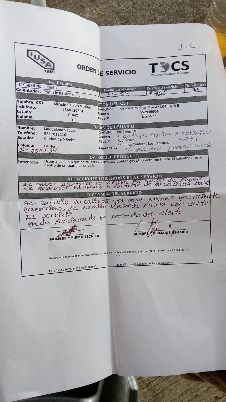 | Usuaria comenta que no calienta el calentador, utiliza gas LP, cuenta con tinaco, el calentador esta dentro de un cuarto de servicio.