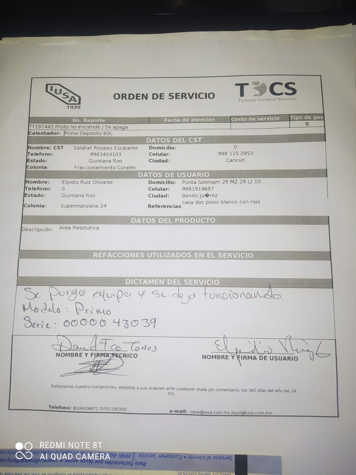 | Refacciones Utilizadas | No Aplica | Tipo de Refacción | No Aplica | ||||||||||||||||