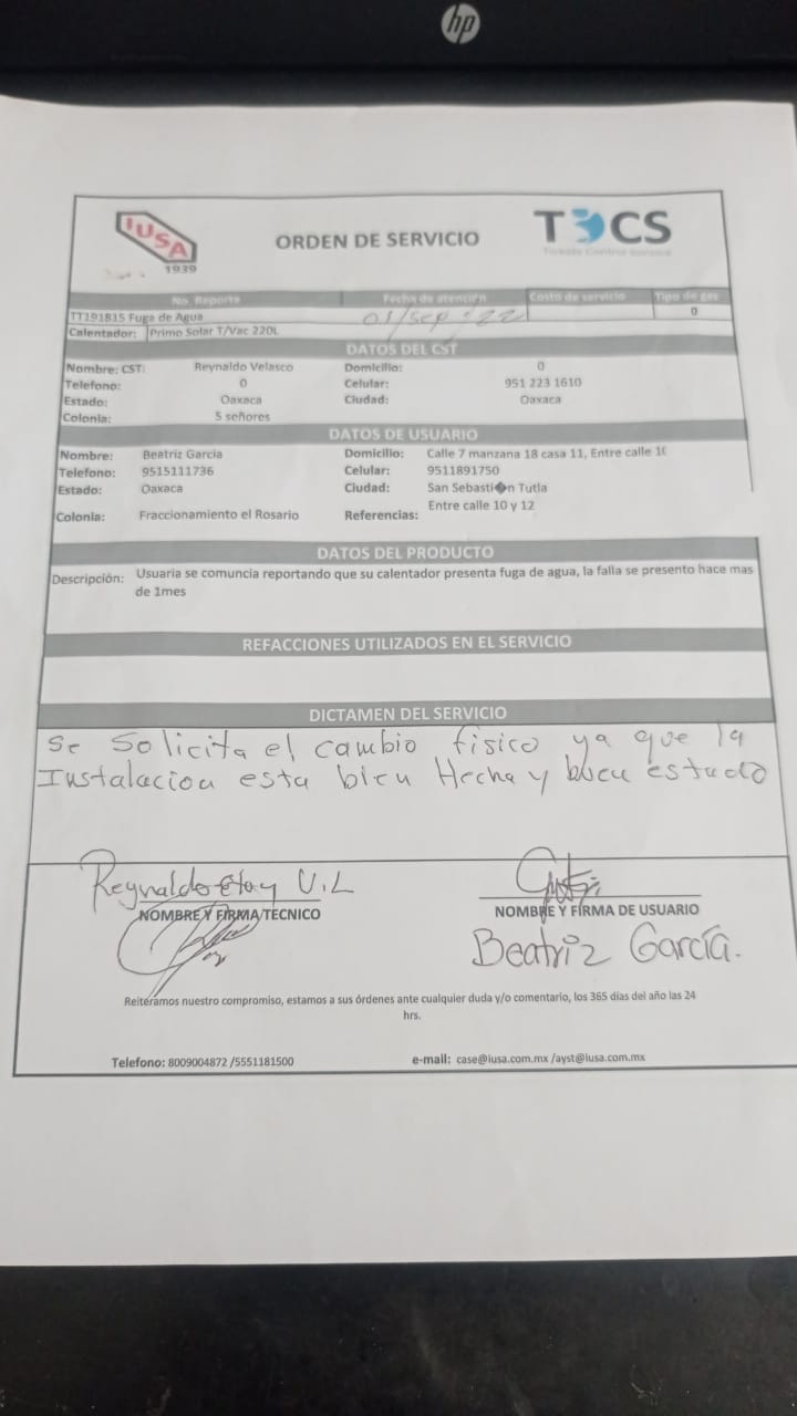 | Usuaria se comuncia reportando que su calentador presenta fuga de agua, la falla se presento hace mas de 1mes
