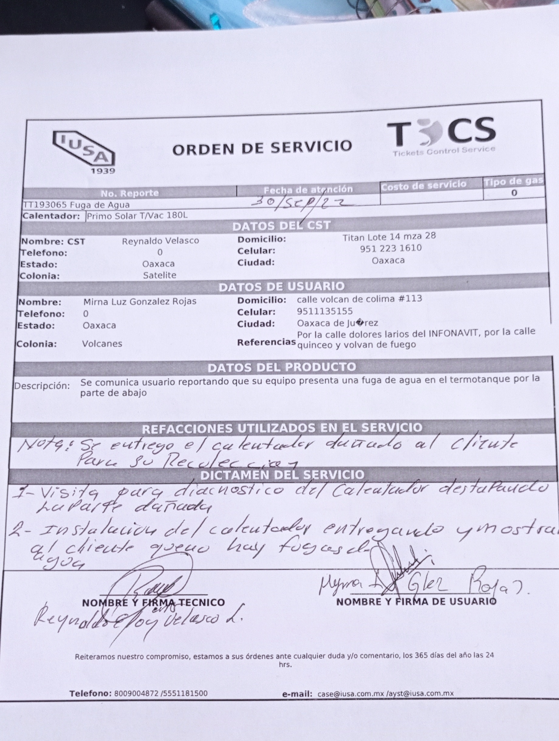 | Se comunica usuario reportando que su equipo presenta una fuga de agua en el termotanque por la parte de abajo