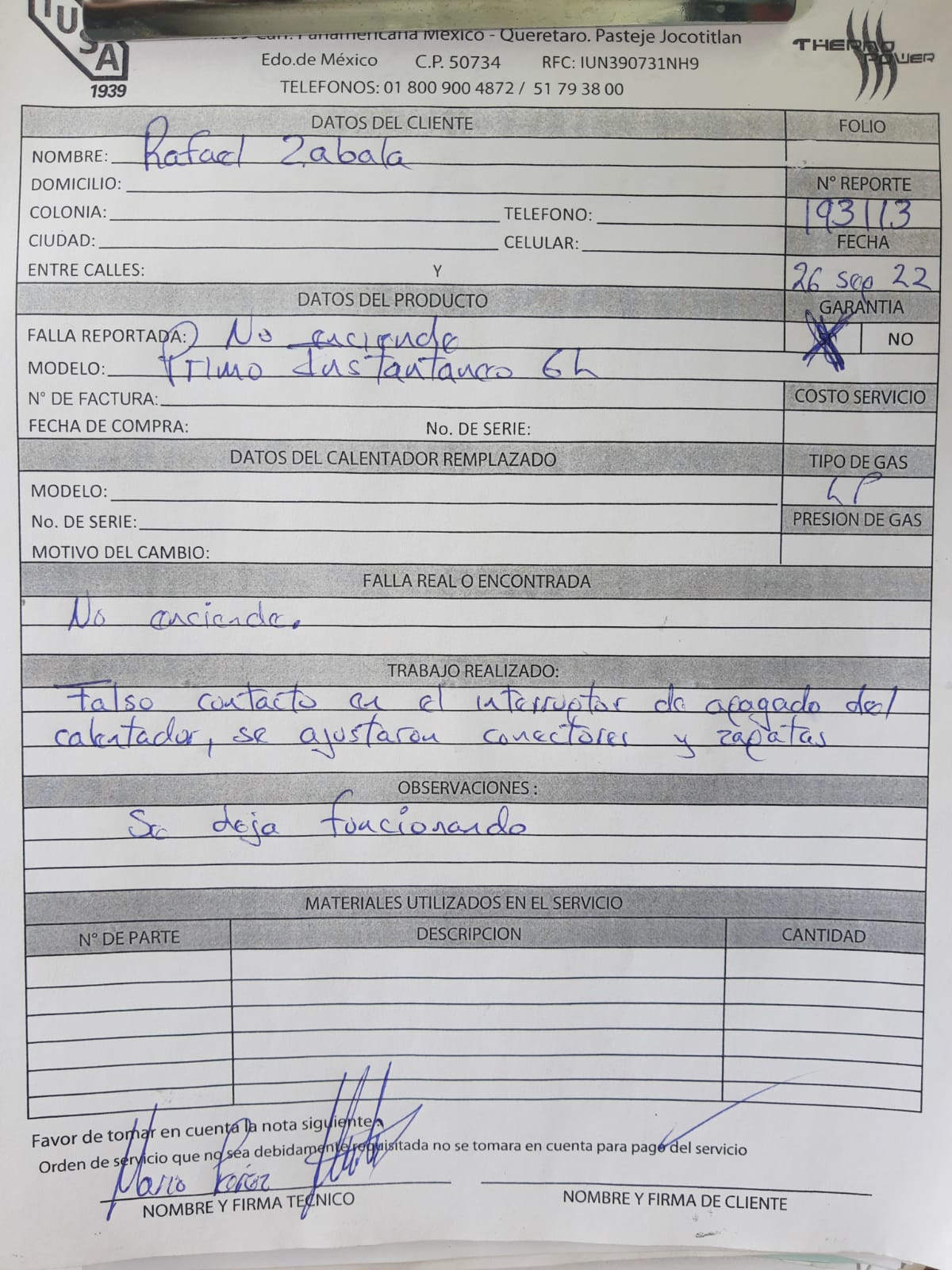 | Técnico | Andres Mario Perez Gonzalez | Fecha Asistencia | 2022-09-26 15:20:00 | ||||||||||||||||