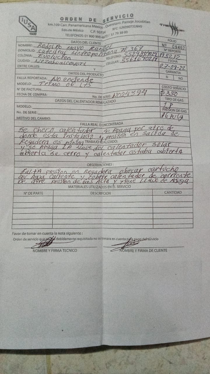 | Usuario comenta que no prende el calentador, utiliza gas LP, la toma es de tinaco, la base del tinaco tiene 1.50 mts, el calentador esta al intemperie, las baterias son Duracell.
