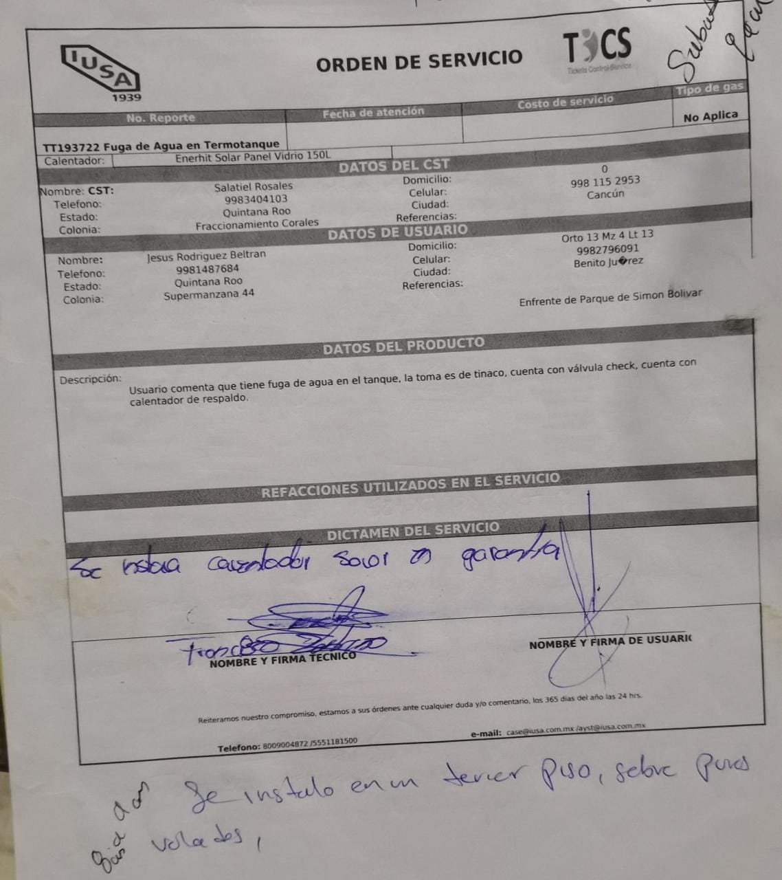 | Usuario comenta que tiene fuga de agua en el tanque, la toma es de tinaco, cuenta con válvula check, cuenta con calentador de respaldo. |