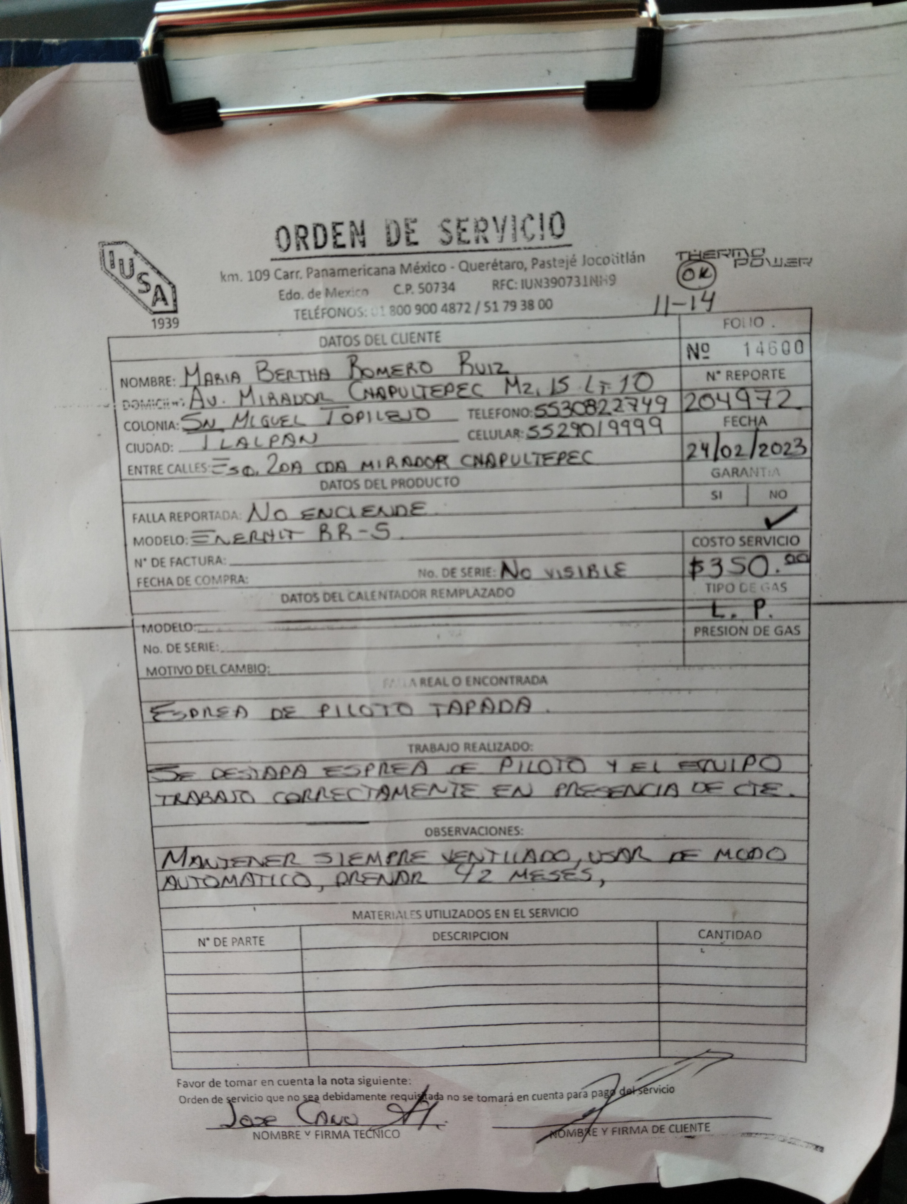 | Refacciones Utilizadas | No Aplica | Tipo de Refacción | No Aplica | ||||||||||||||||