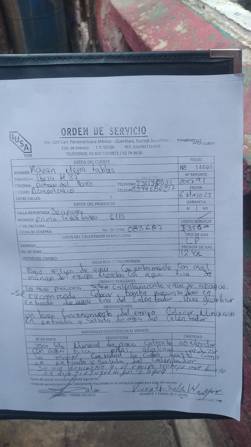 | Material | CALENTADOR INSTANTÁNEO GAS L.P. 06 | Tipo Producto | |