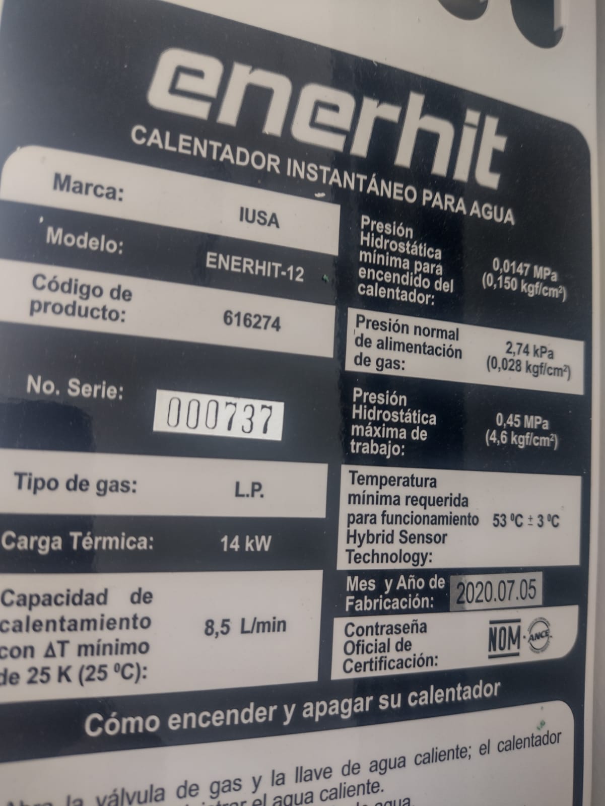 | Material | CALENTADOR INSTA IUSA ENERHIT 12L LP | Tipo Producto | |