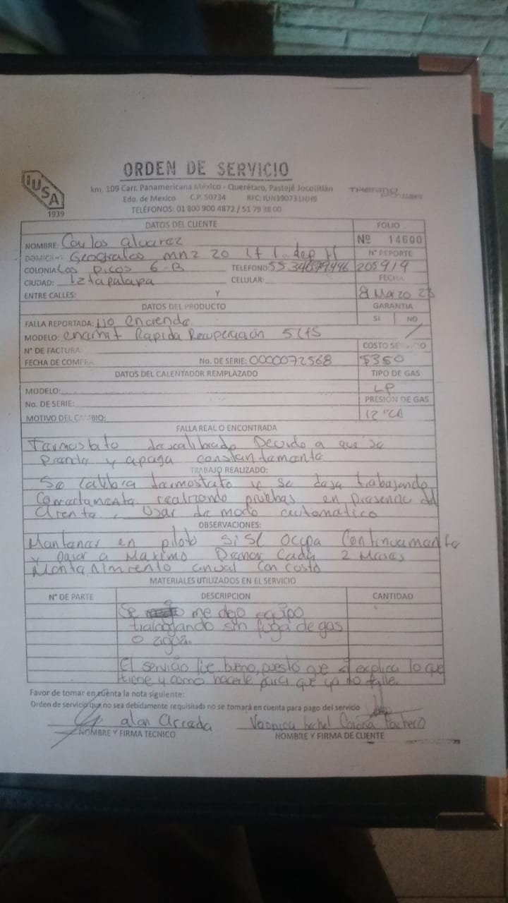| Se comunica usuario reportando que su equipo no enciende, utiliza gas LP, se suministra de tinaco, cuenta con base el tinaco, la falla se presento el día sabado, el equipo funcionaba bien antes del sábado. Usuario menciona se realizo mantenimiento al equipo |