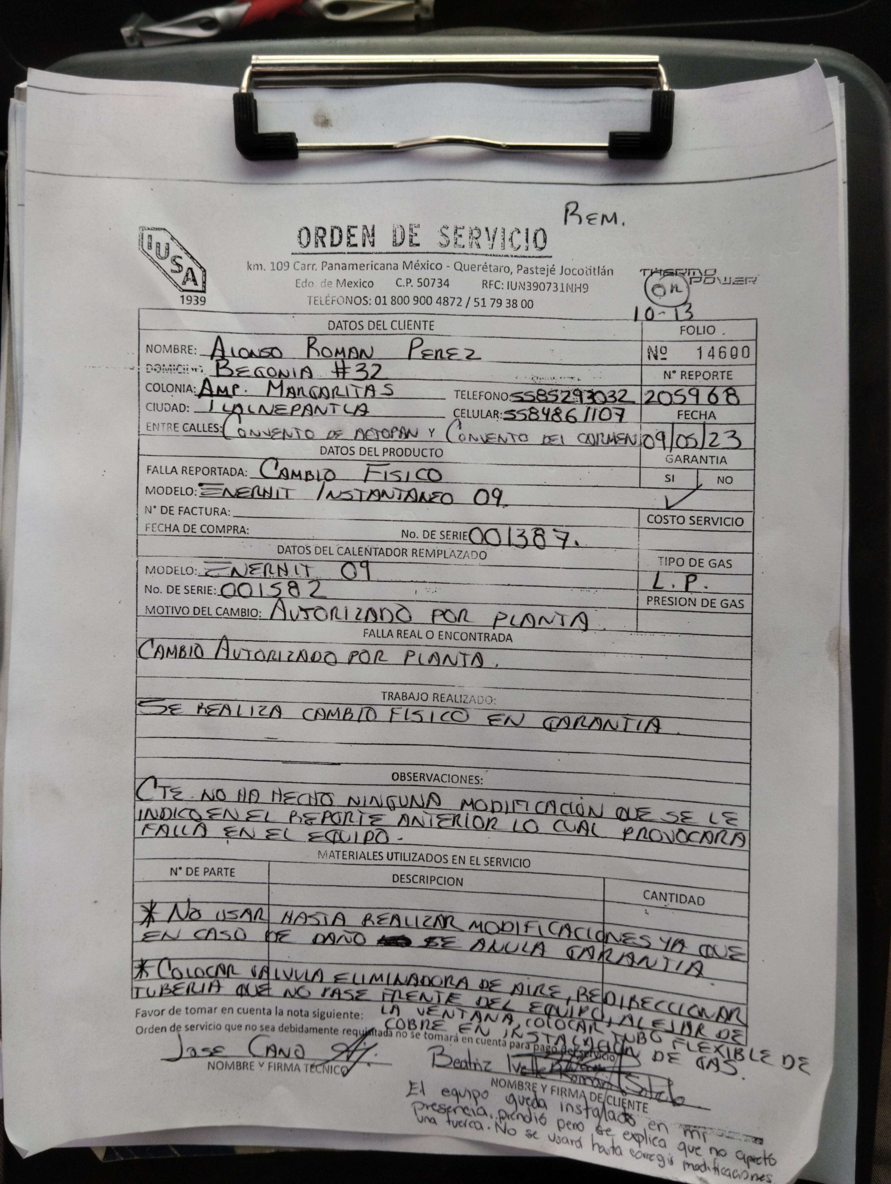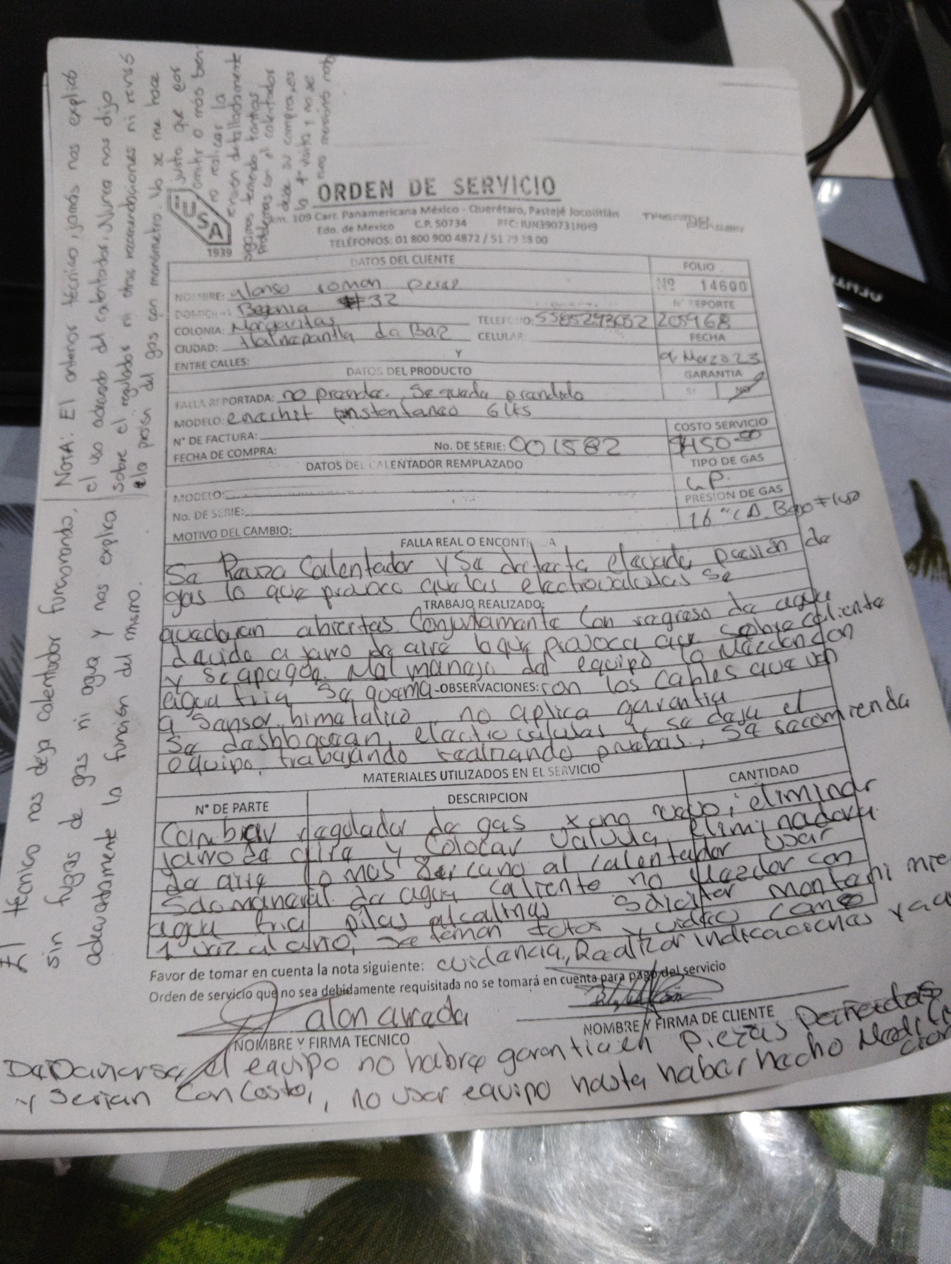 Falla: El día jueves al terminar de bañarme a las 16:30 hrs, aparentemente todo normal, pero mi papá observó que salía agua y vapor en la azotea, se puso a verificar y observó que el boiler en la pantalla que tiene, se encendía y se apagaba, señalando variaciones de 46°, 68°, 55°y salía un olor muy fuerte a quemado y gas, se bajaron las perillas al mínimo y de pronto empezaron a salir llamas por arriba del boiler, mi papá corrió cerró la llave del gas y por agua para apagarlo. Usa agua de tinaco, usa gas LP con regulador de gas nuevo, las pilas son nuevas y jamas se ha manipulado el equipo, en este momento tiene la llave de gas cerrara sin poder usar la estufa porque el gas se sale del boiler |