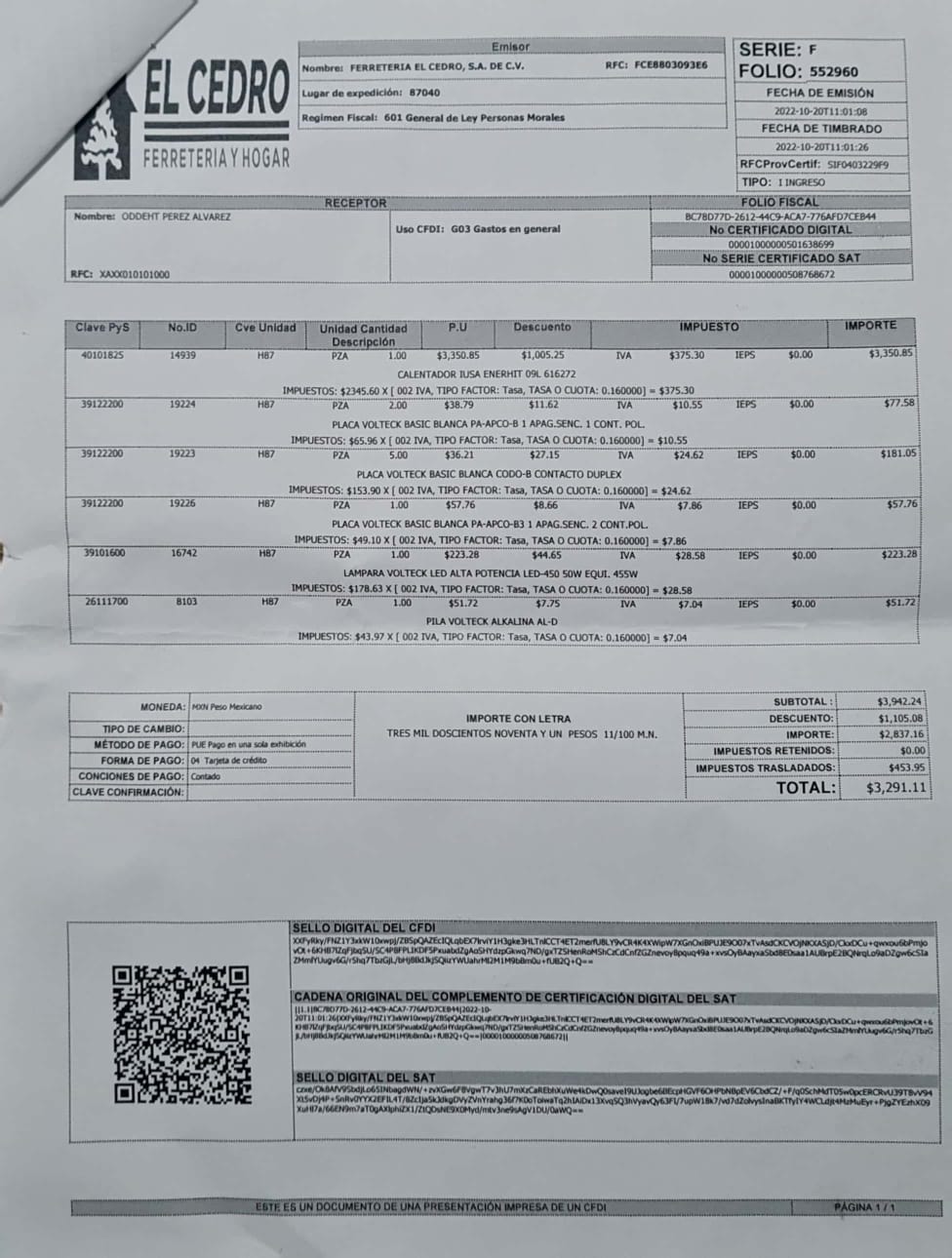 | Fecha de Compra | 2022-11-15 | Lugar de Compra | Ferreteria Isedro |