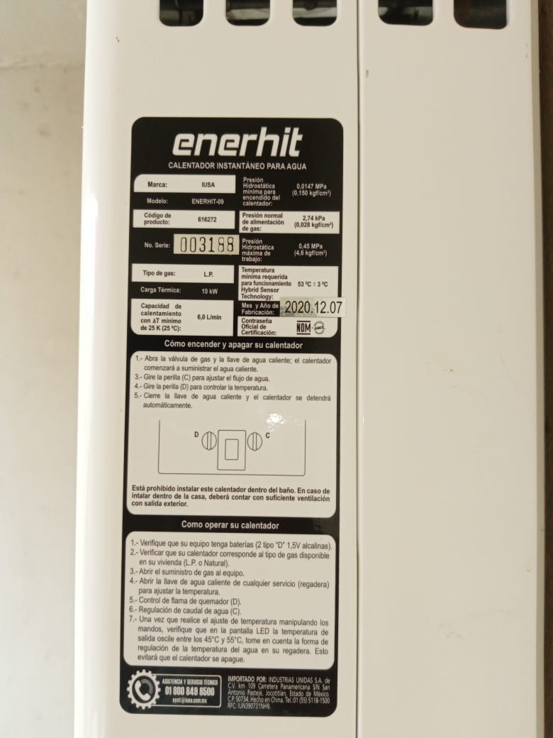 | Material | CALENTADOR INSTA IUSA ENERHIT 12L LP | Tipo Producto | |