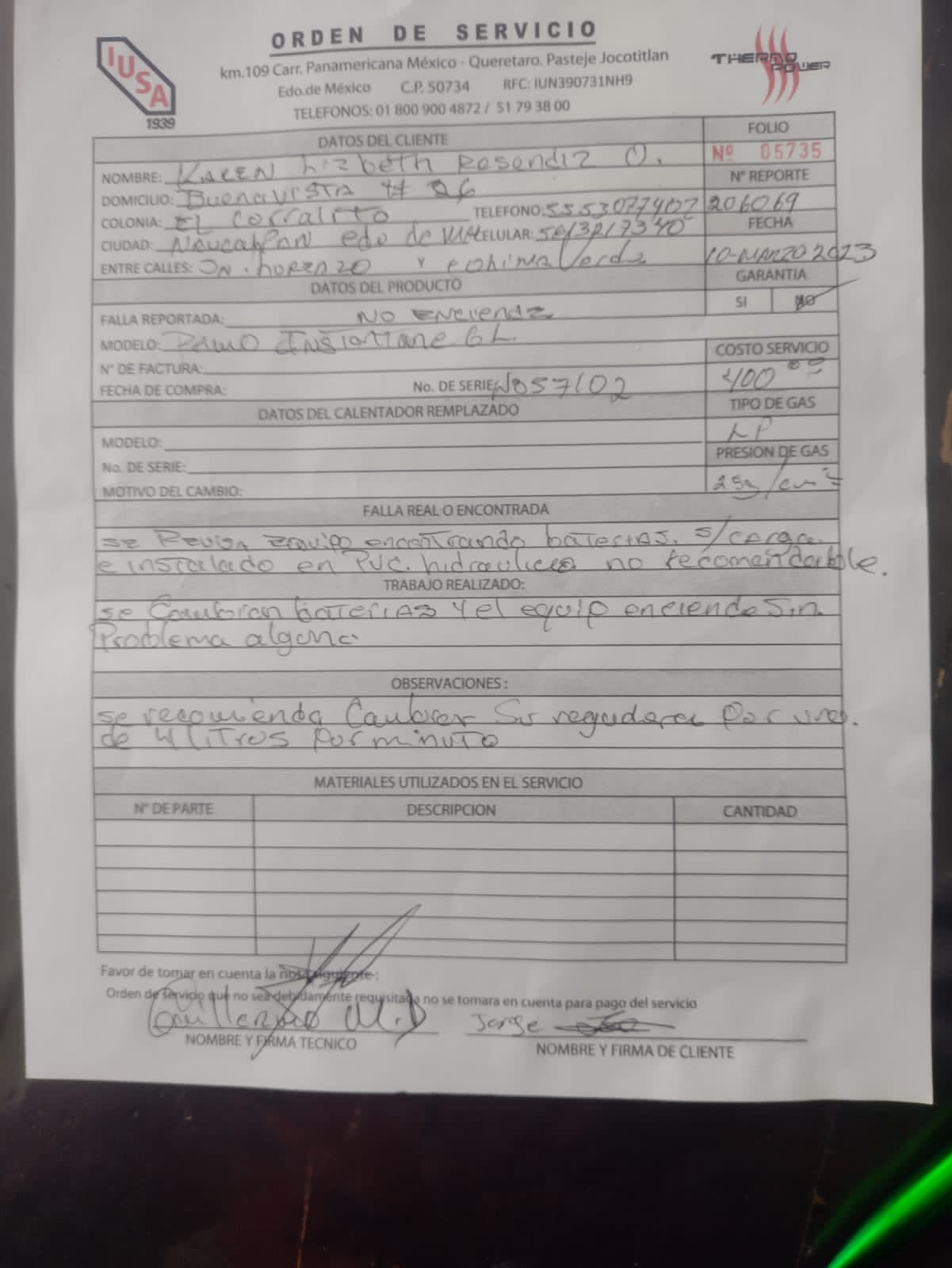 | Se comunica usuario mencionando que su equipo no enciende, si genera chispa, utiliza gas LP, regulador de gas nuevo de baja presion, se suministra de agua por medio de un tinaco, el tinaco no cuenta con base menciona que del tinaco al boiler son 3 metros de altura, baterias nuevas alcalinas, boton de encendido en posicion, perillas al maximo. |
