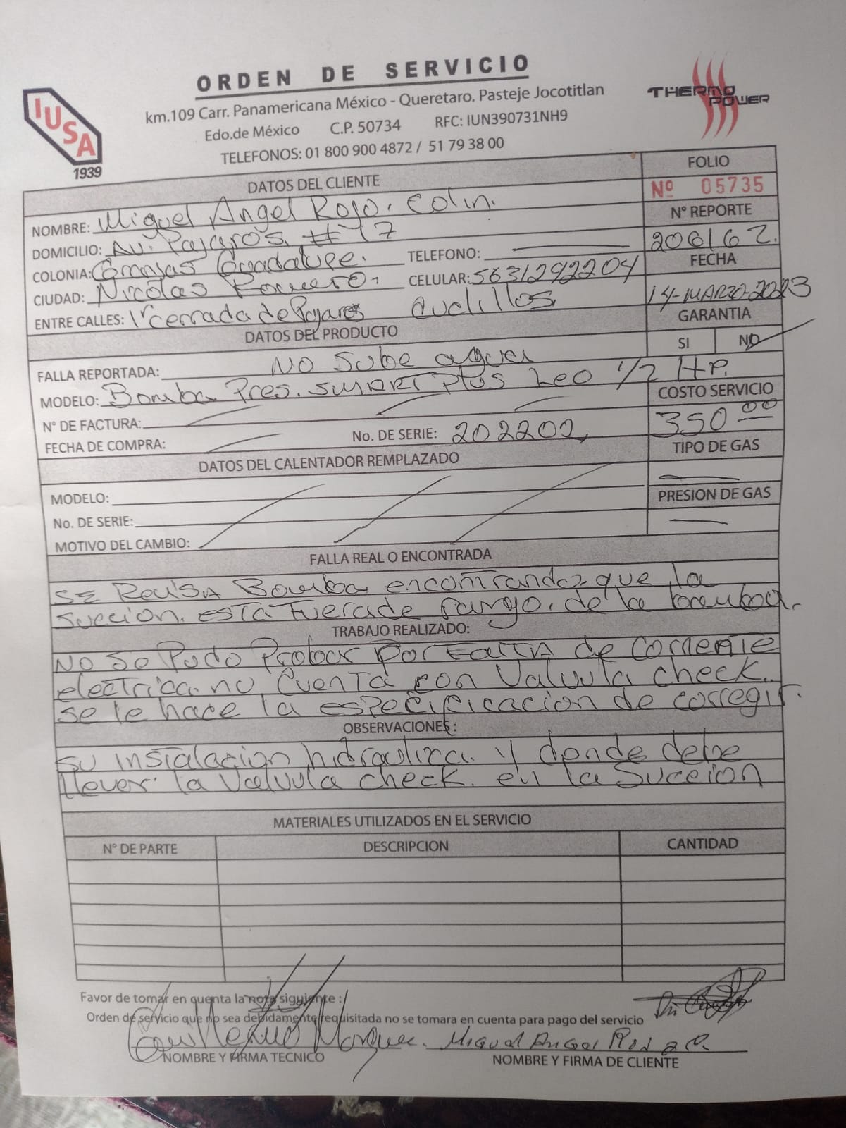 | Se comunica usuario mencionando que su equipo no cuenta con presión de agua, carga eléctrica de 120V, uso domestico. |
