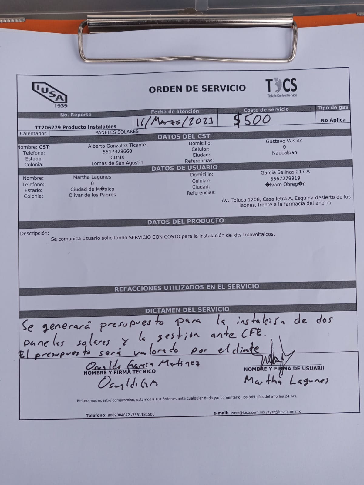 | Se comunica usuario solicitando SERVICIO CON COSTO para la instalación de kits fotovoltaicos. |