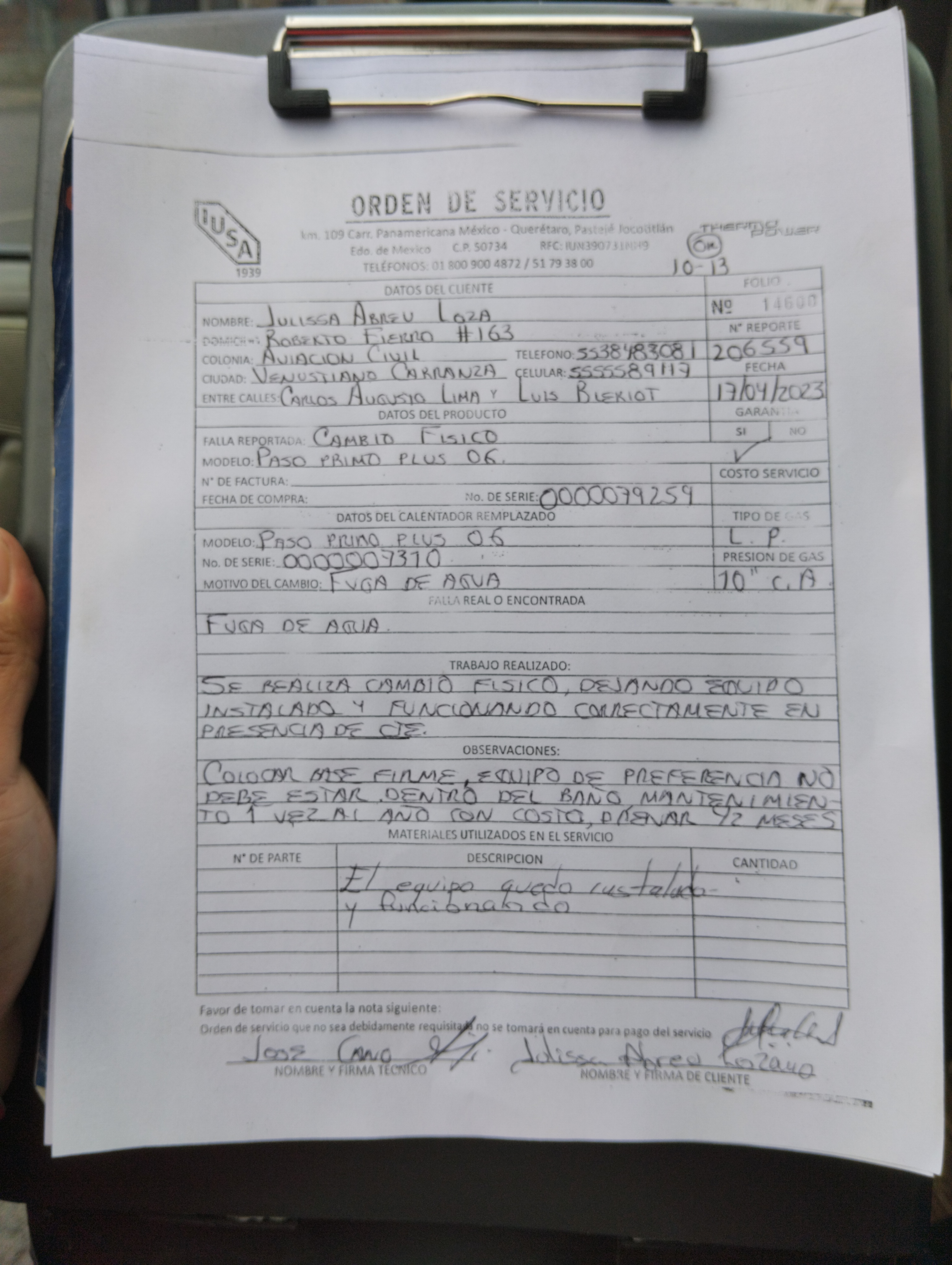 | Se comunica usuario mencionando que su equipo presenta una fuga de agua en el interior del tanque, menciona que drenaba su equipo cada meses, utiliza gas Lp, se suministra de agua por medio de un tinaco |