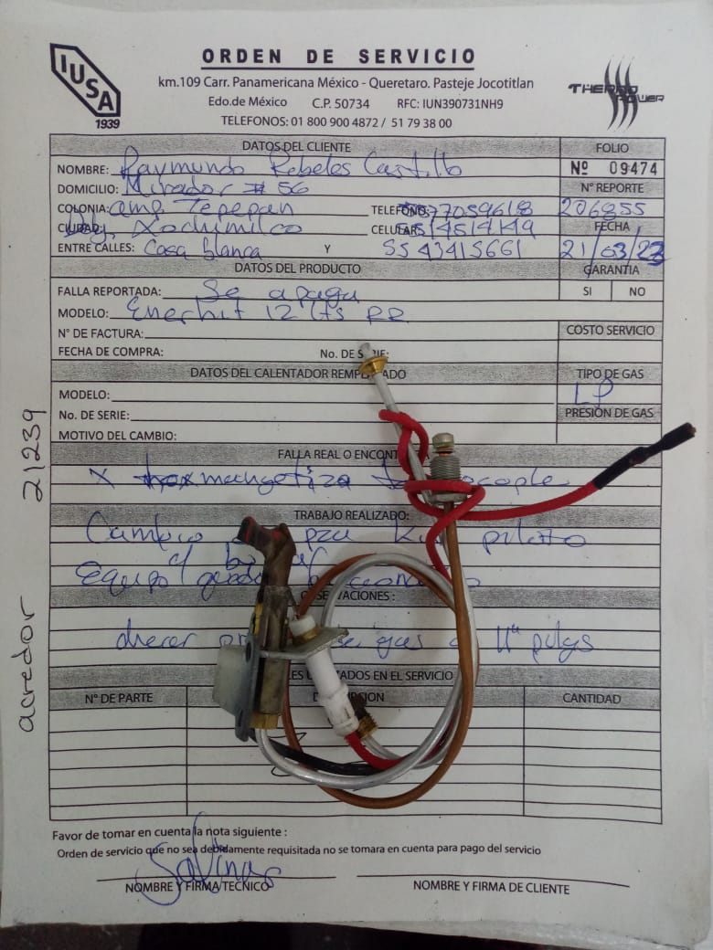 | Equipo 2: Usuario reporta que el piloto de su equipo no enciende automáticamente, indica que tiene que realizarlo manual, utiliza gas lp, regulado de gas de baja presio, hace poco cambio la bateria del equipo, se suministra de agua por medio de un tinaco, |