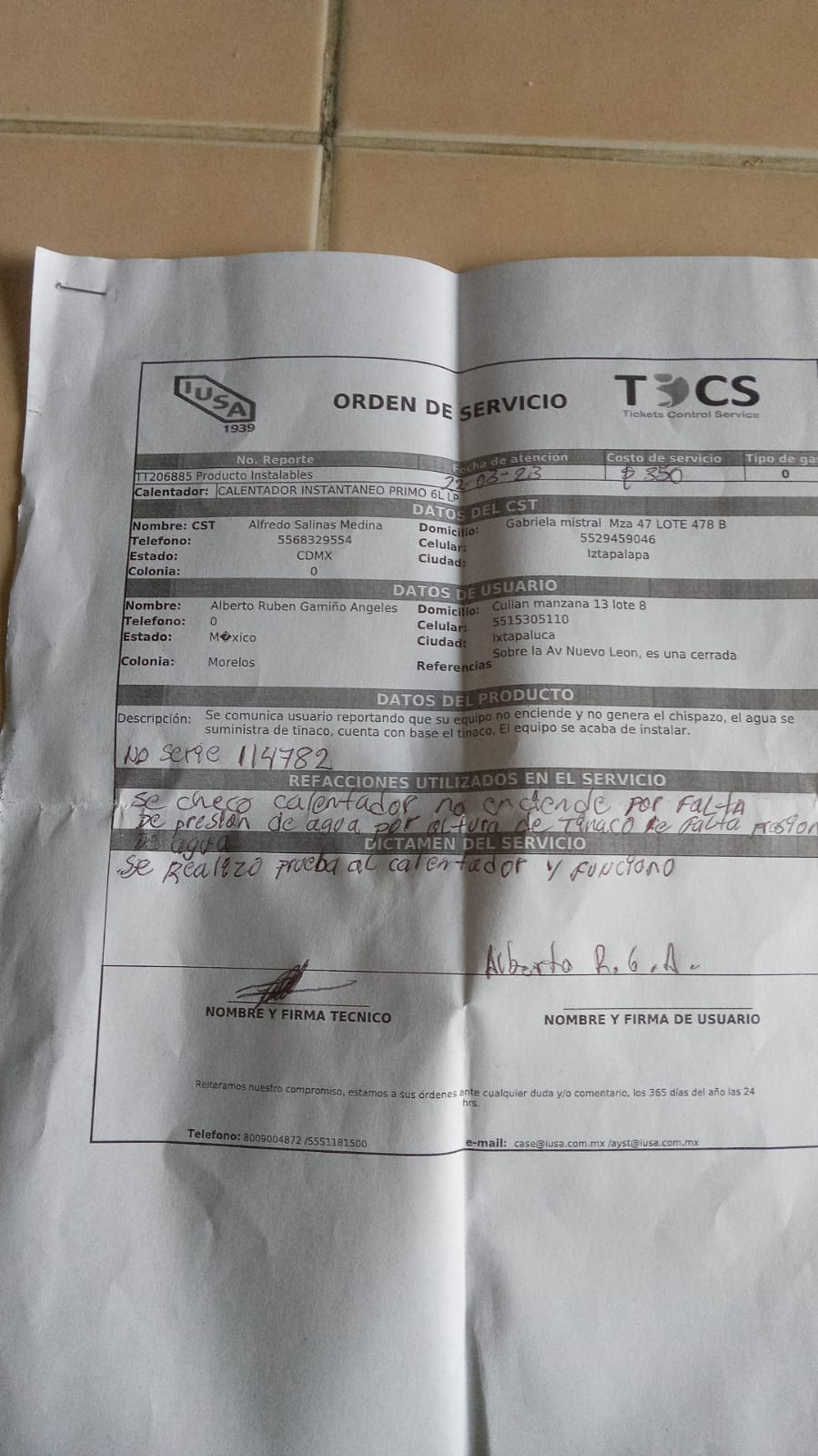 | Se comunica usuario reportando que su equipo no enciende y no genera el chispazo, el agua se suministra de tinaco, cuenta con base el tinaco, El equipo se acaba de instalar.