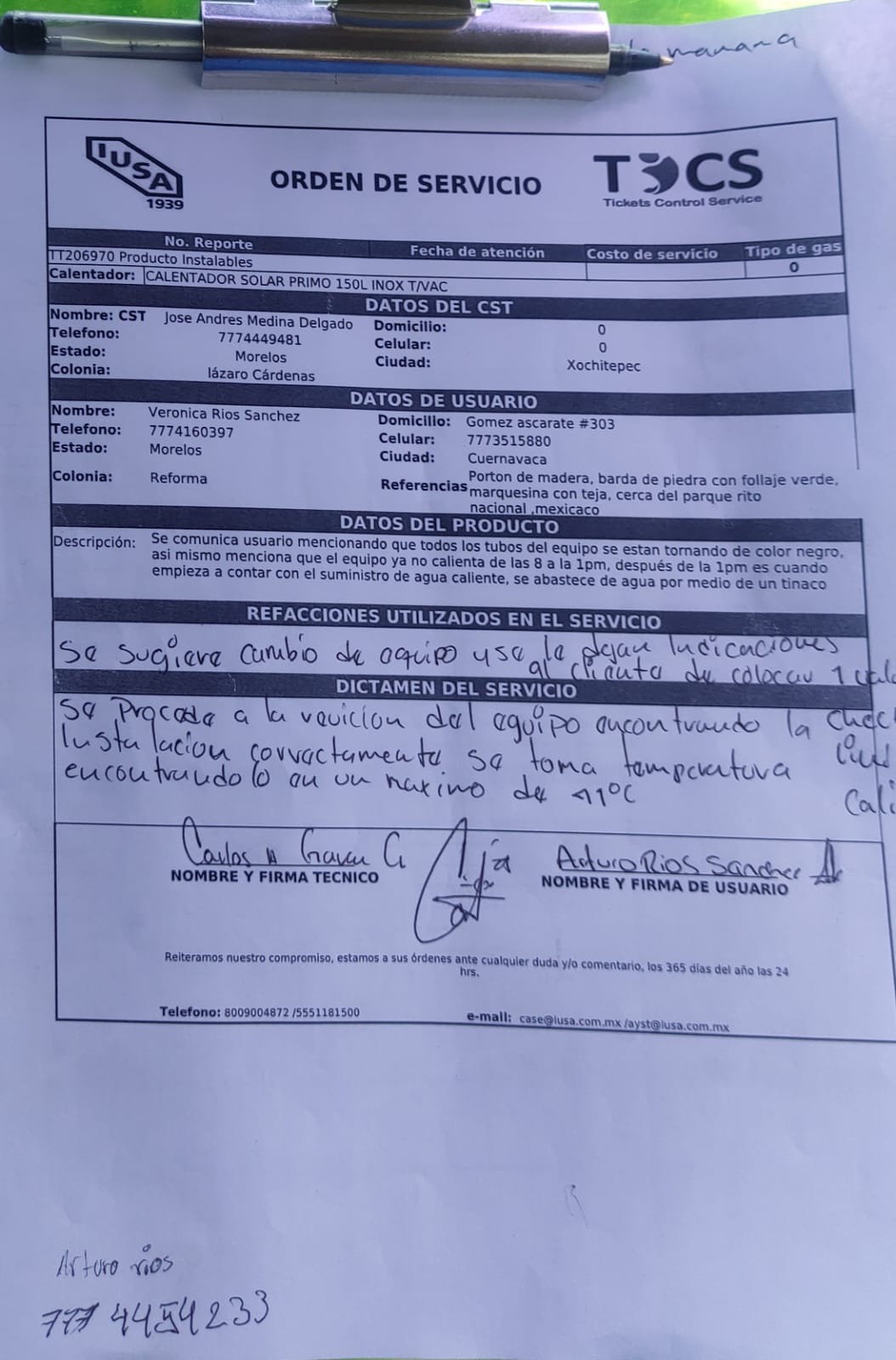 | Se comunica usuario mencionando que todos los tubos del equipo se estan tornando de color negro, asi mismo menciona que el equipo ya no calienta de las 8 a la 1pm, después de la 1pm es cuando empieza a contar con el suministro de agua caliente, se abastece de agua por medio de un tinaco |