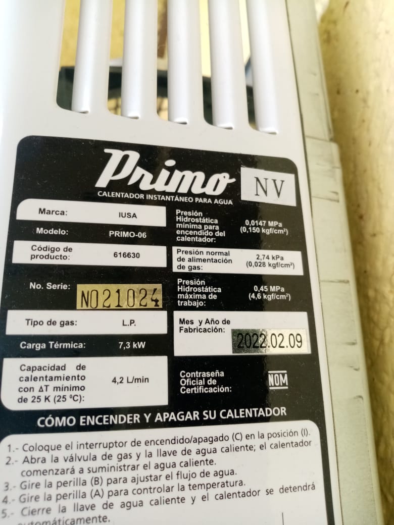 | Material | CALENTADOR INSTANTANEO PRIMO 6L LP | Tipo Producto | |