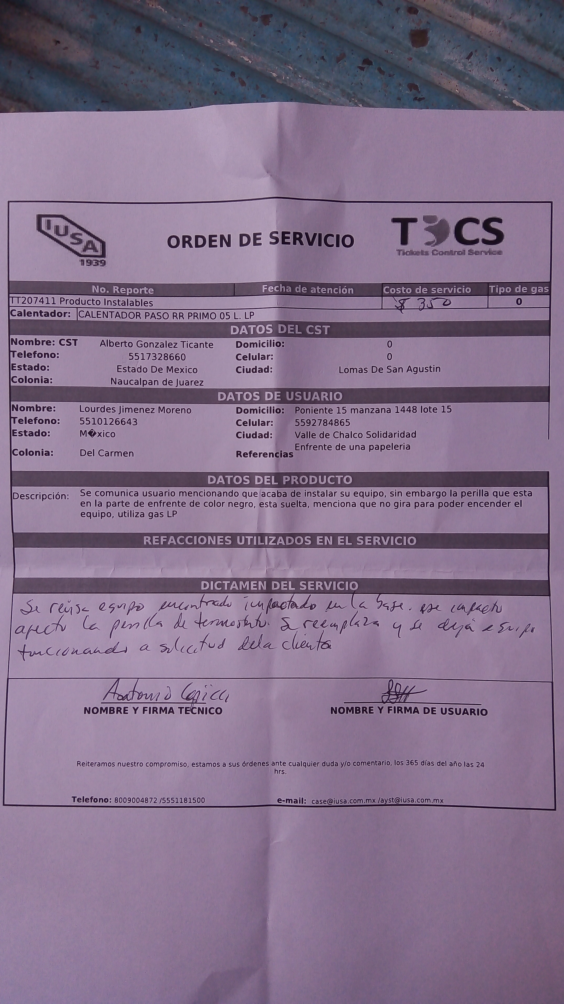 | Refacciones Utilizadas | SI | Tipo de Refacción | TERMOSTATO IUSATROL QyP 7/16 | ||||||||||||||||