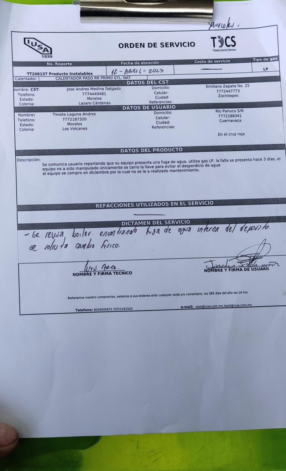 | Se comunica usuario reportando que su equipo presenta una fuga de agua, utiliza gas LP, la falla se presento hace 3 días, el equipo no a sido manipulado únicamente se cerro la llave para evitar el desperdicio de agua