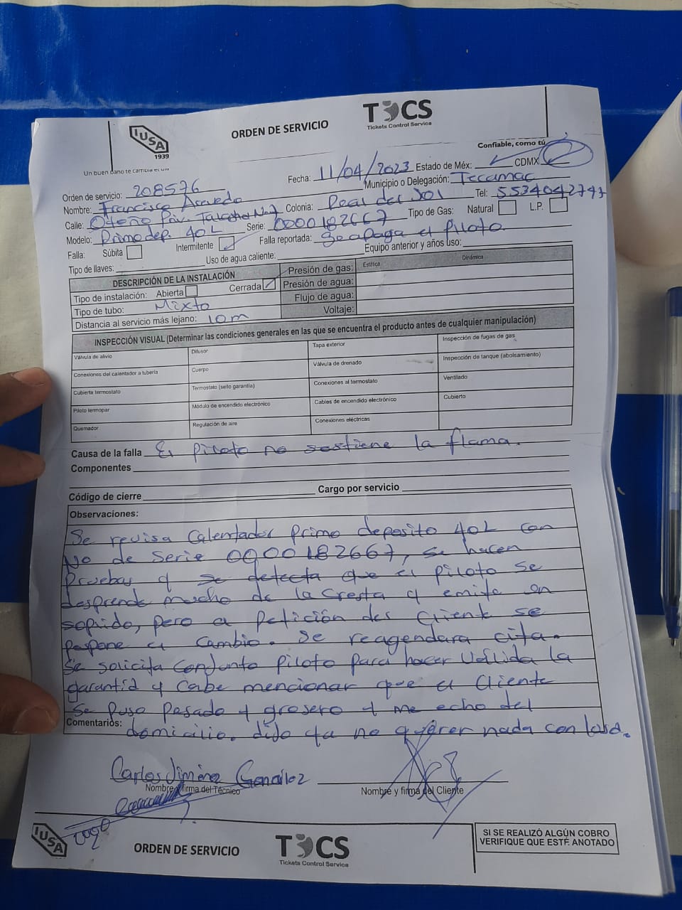 Recientemente se le cambio el termostato en el reporte TT206221 pero la falla se presento de nuevo. SOlicita acuda un téncnico. Utiliza gas lp, si cuenta con regulador de gas de baja presión, cuenta con dos años de uso el regulador, |