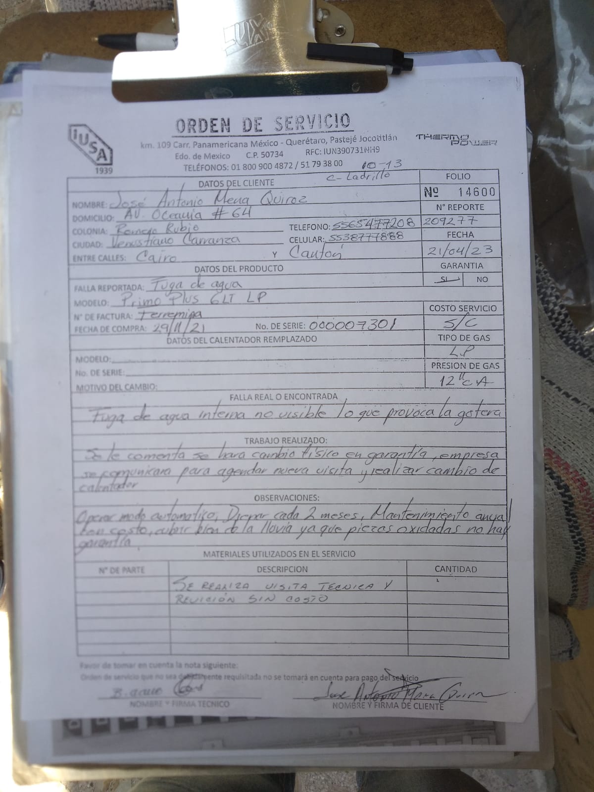 | Se comunica usuario reportando que su equipo presenta un a fuga de agua interna, utiliza gas LP, se suministra de tinaco, cuenta con base el tinaco, no cuenta con bomba, la falla se presentó el día sábado, se realizó la purga pero la falla no quedó solventada, no se le ha realizado mantenimiento desde que se adquirió en el 2021. |