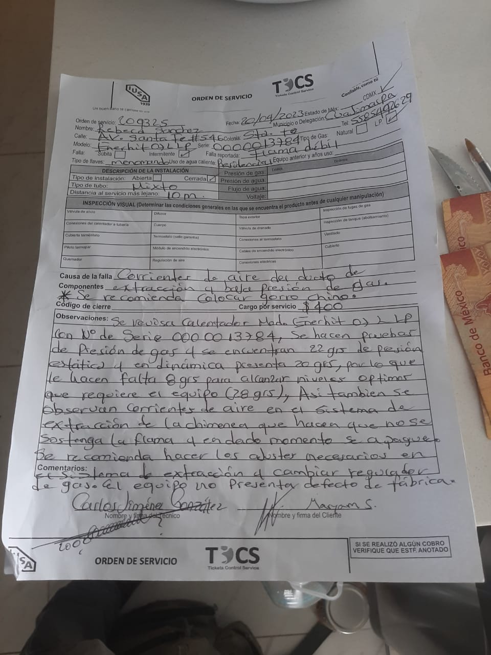 | Se comunica usuario indicando que instalo su calentador hace dos días y desde entonces no se mantiene encendido, la flama es muy pequeña, tiene dudas sobre si la instalacion realizada es la correcta por eso solicita una visita técnica aunque se cobre. |