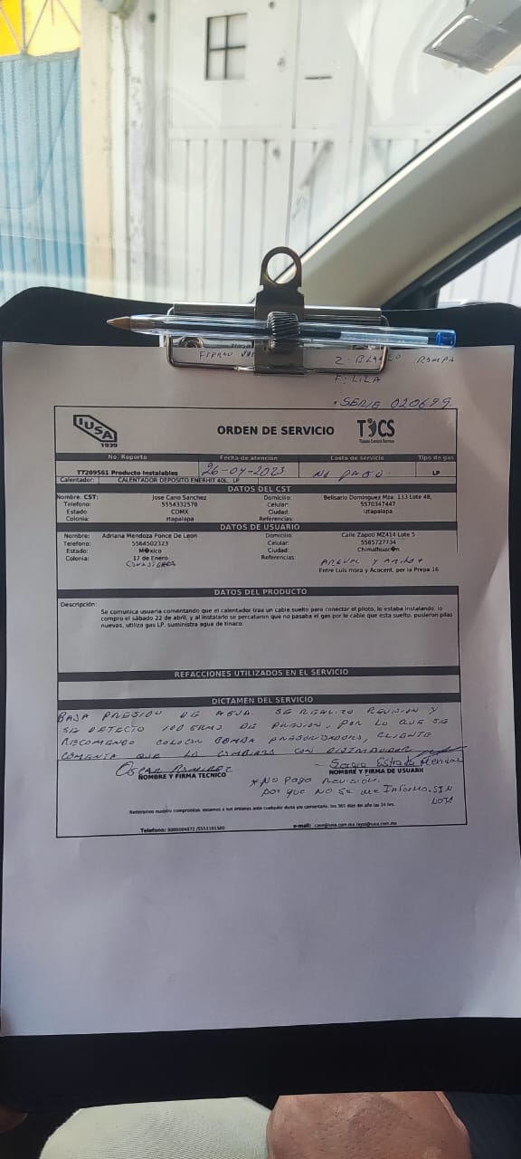 | Se comunica usuaria comentando que el calentador trae un cable suelto para conectar el piloto, lo estaba instalando, lo compro el sábado 22 de abril, y al instalarlo se percataron que no pasaba el gas por le cable que esta suelto, pusieron pilas nuevas, utiliza gas LP, suministra agua de tinaco. |