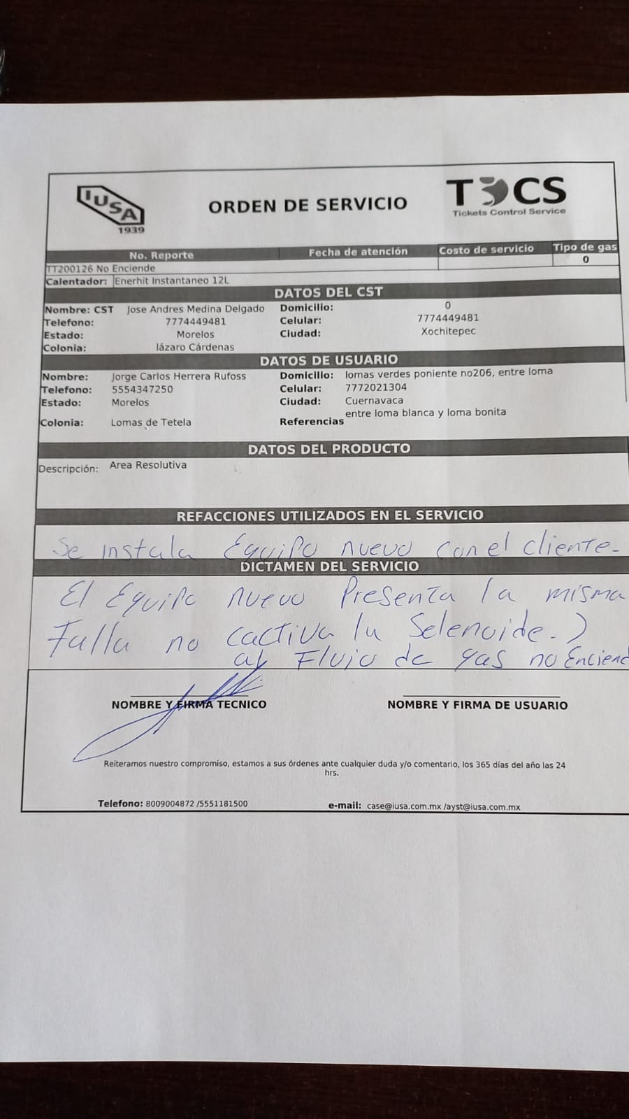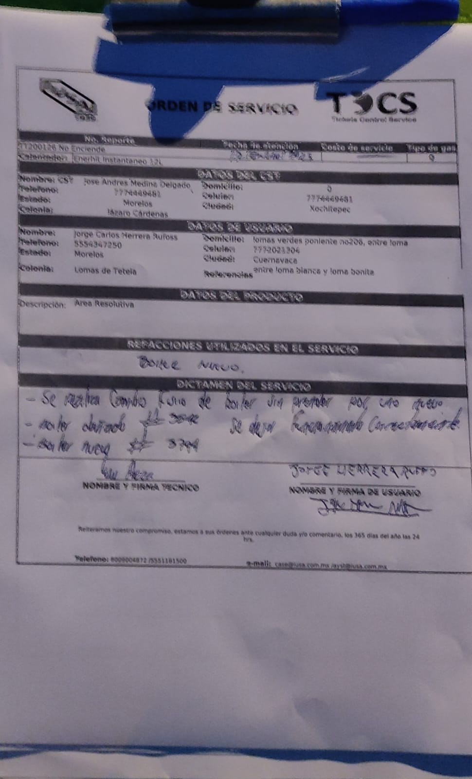 | Refacciones Utilizadas | SI | Tipo de Refacción | TERMOTANQUE CON BASE METALICA 23" | ||||||||||||||||