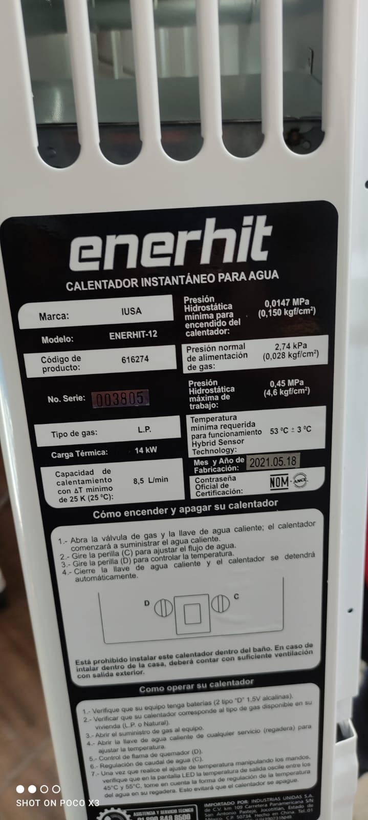 | Material | CALENTADOR INSTA IUSA ENERHIT 12L LP | Tipo Producto | |