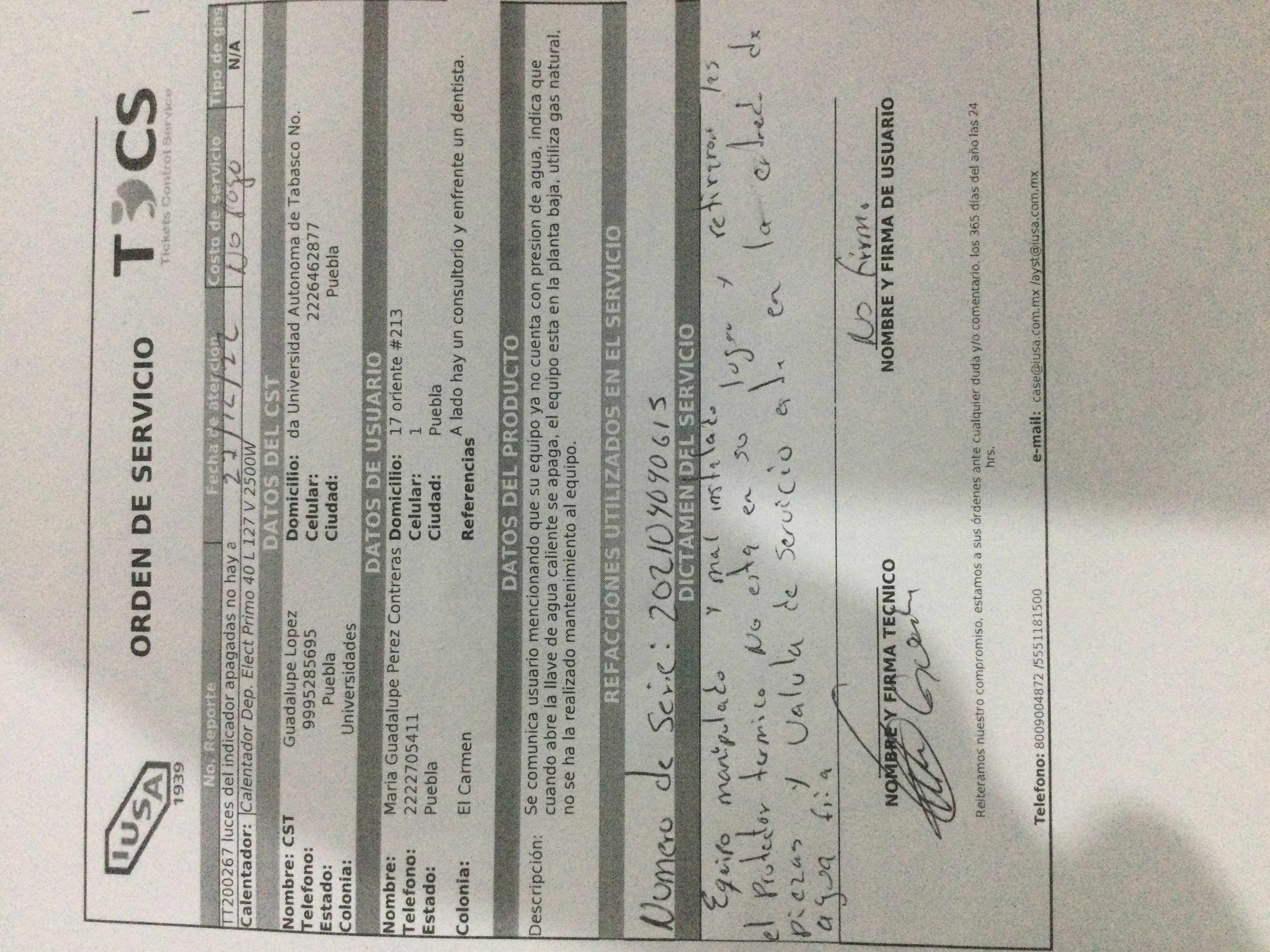 | Refacciones Utilizadas | No Aplica | Tipo de Refacción | No Aplica | ||||||||||||||||