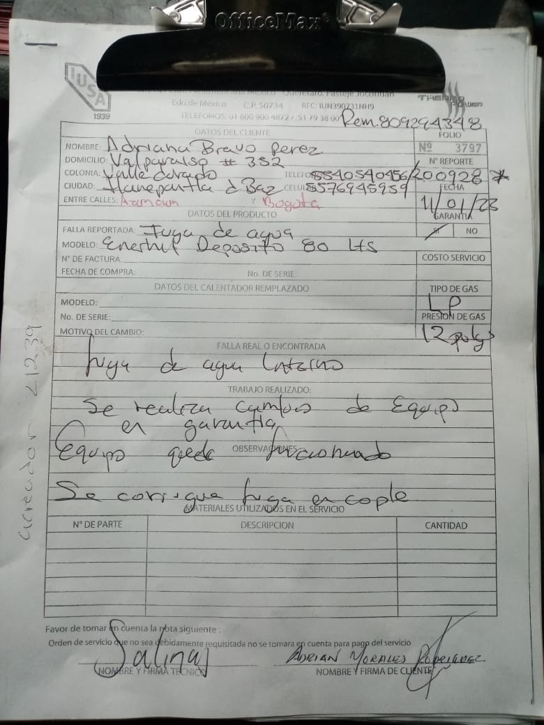 | Problema:Usuario se comunica para reportar su equipo el cual indica que fuga agua del tanque
