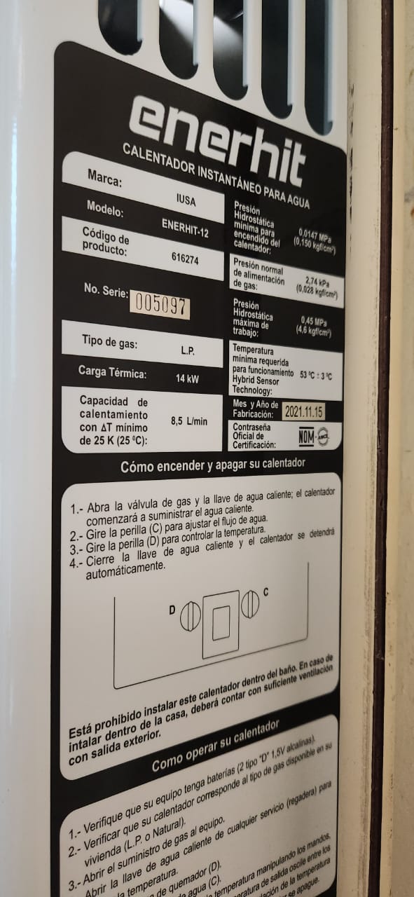 | Material | CALENTADOR INSTA IUSA ENERHIT 12L LP | Tipo Producto | |