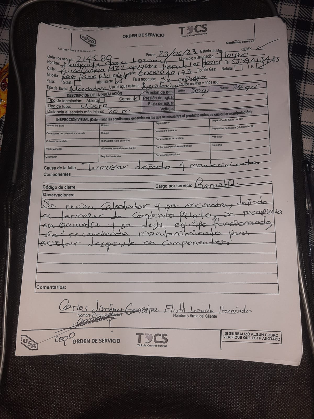 | Refacciones Utilizadas | SI | Tipo de Refacción | CONJ.TERMOPAR-PILOTO PARA ENC.-ELEC. | ||||||||||||||||
