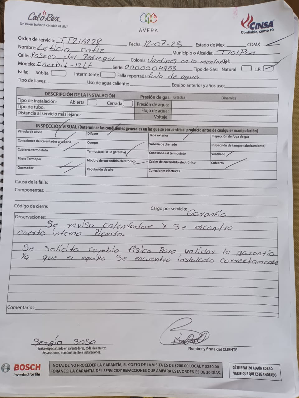 | Usuario reporta que su calentador presenta una fuga de agua en el termotanque, o deposito su suministro de agua es de tinaco, |