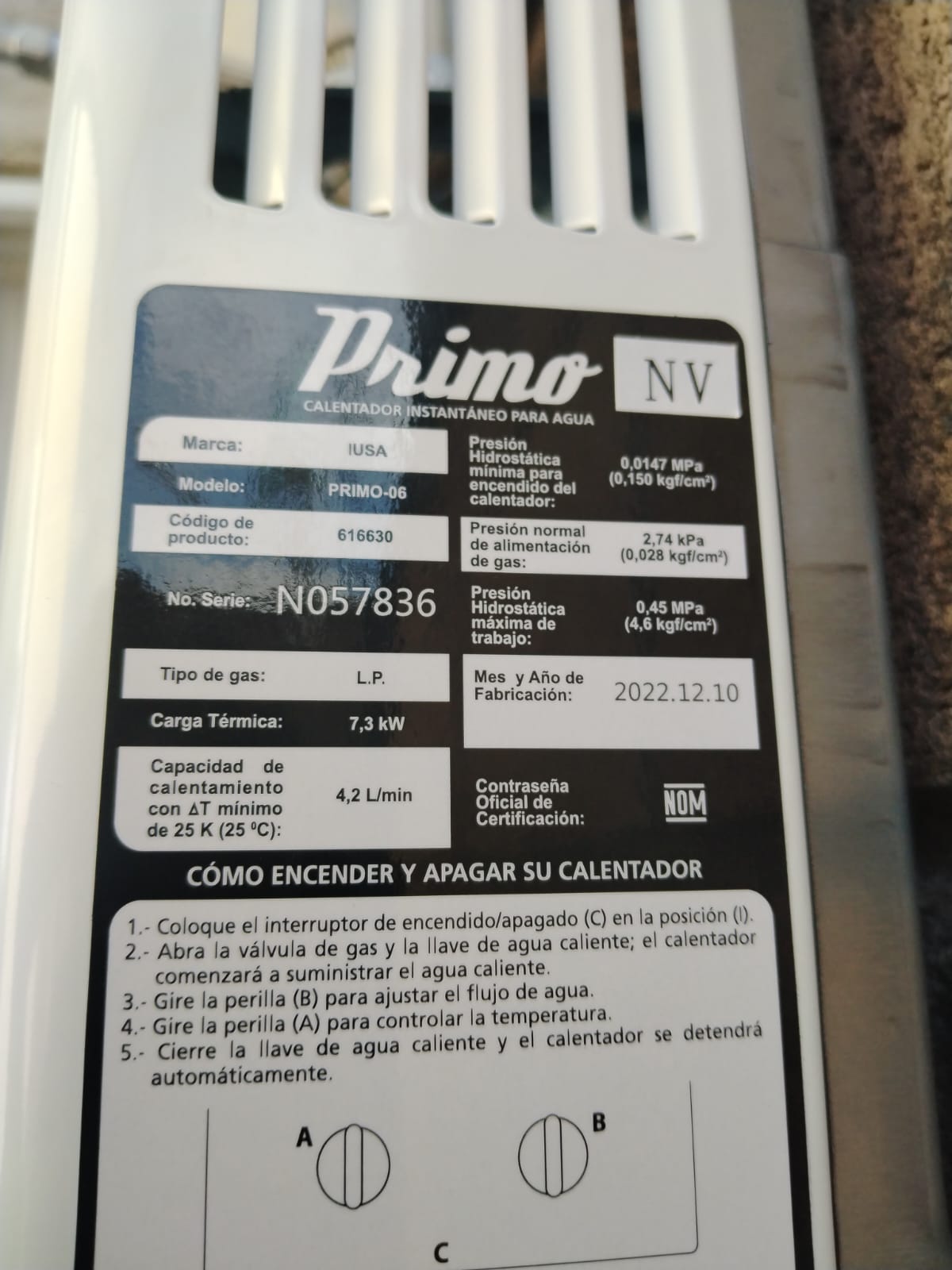| Material | CALENTADOR INSTANTANEO PRIMO 6L LP | Tipo Producto | |