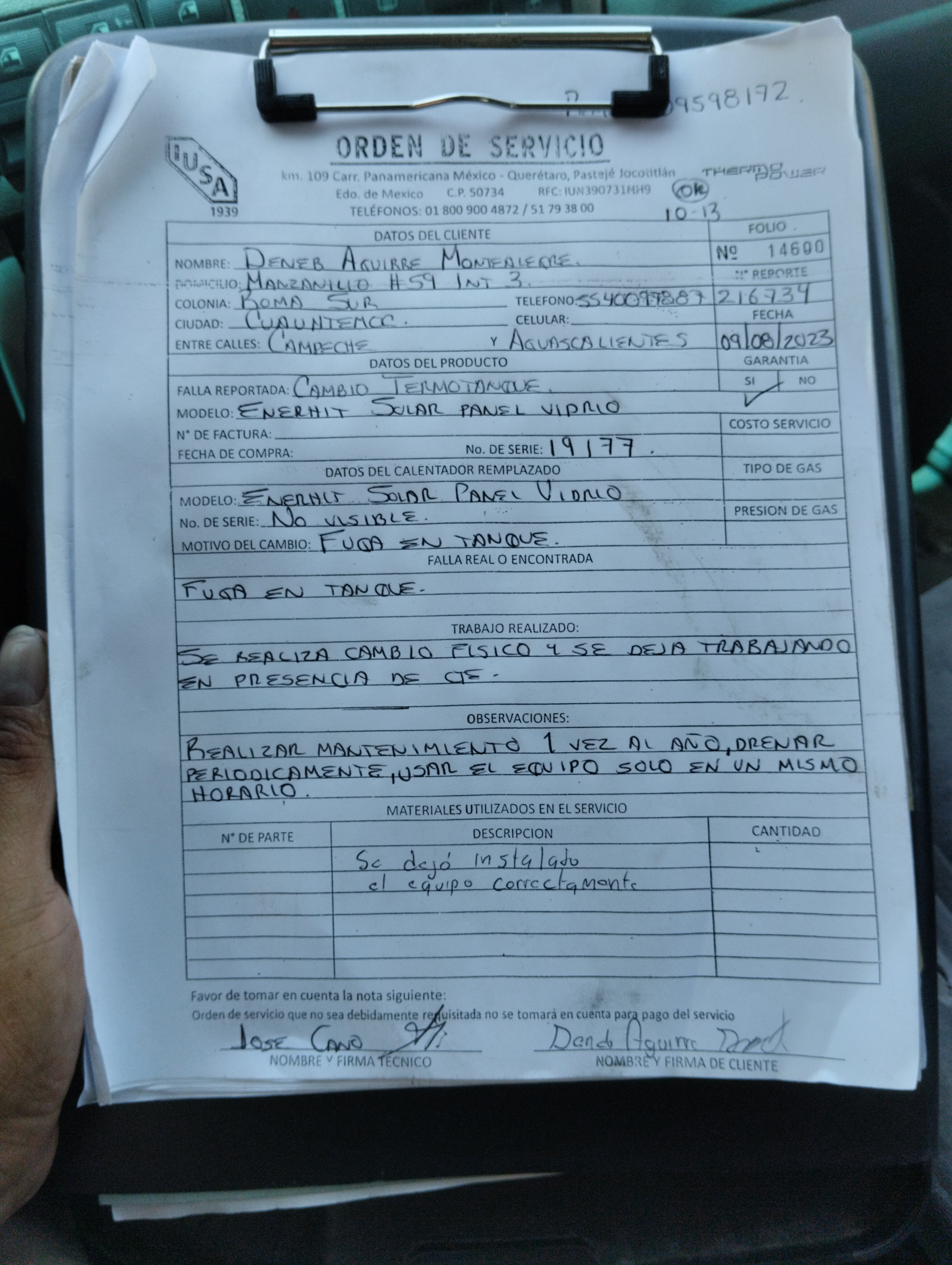| Usuario a traves de WhatsApp reporta que su calentador en una de las salidas de agua empezo a tener fuga abundante, el suministro es de un tinaco que no tiene base, esta sobre loza, el equipo funciono bien, lo compro hace 4 meses |