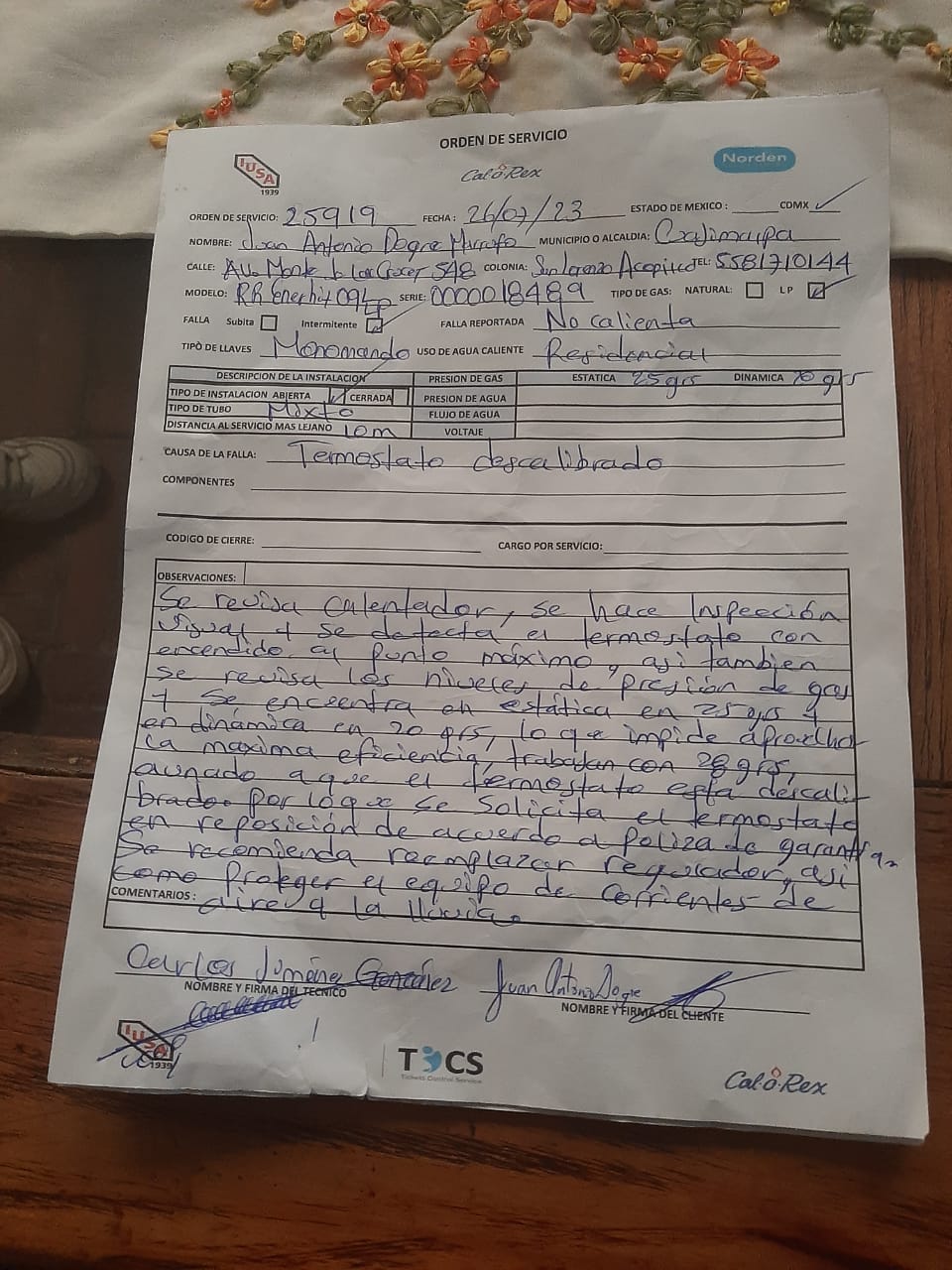 | Se comunica usuario indicando que el calentador enciende al máximo, la flama es amarilla no roja, menciona su plomero que esta mal calibrado no calienta como debe, utiliza gas LP, suministra agua de tinaco. |