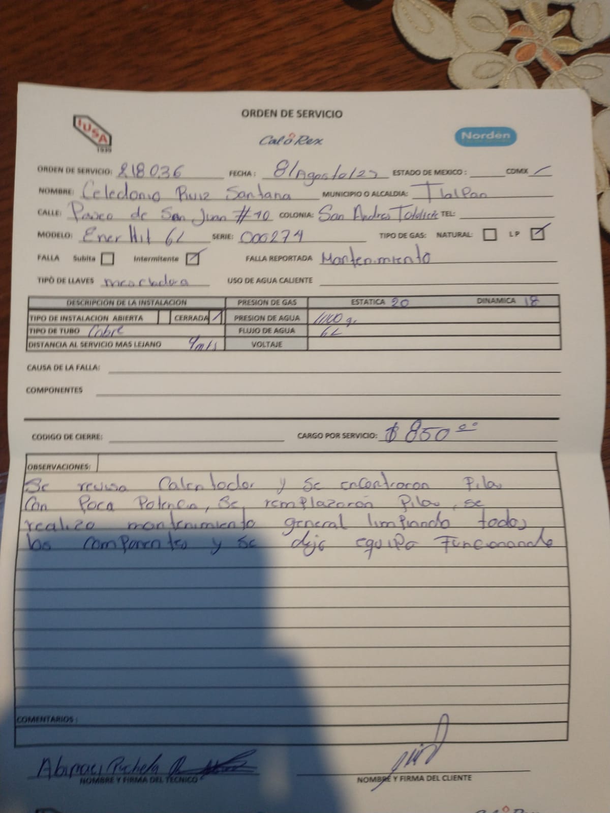 | Se comunica usuario solicitando un servicio con costo para el mantenimiento de su calentador ya que menciona que prende y se apaga su calentador |