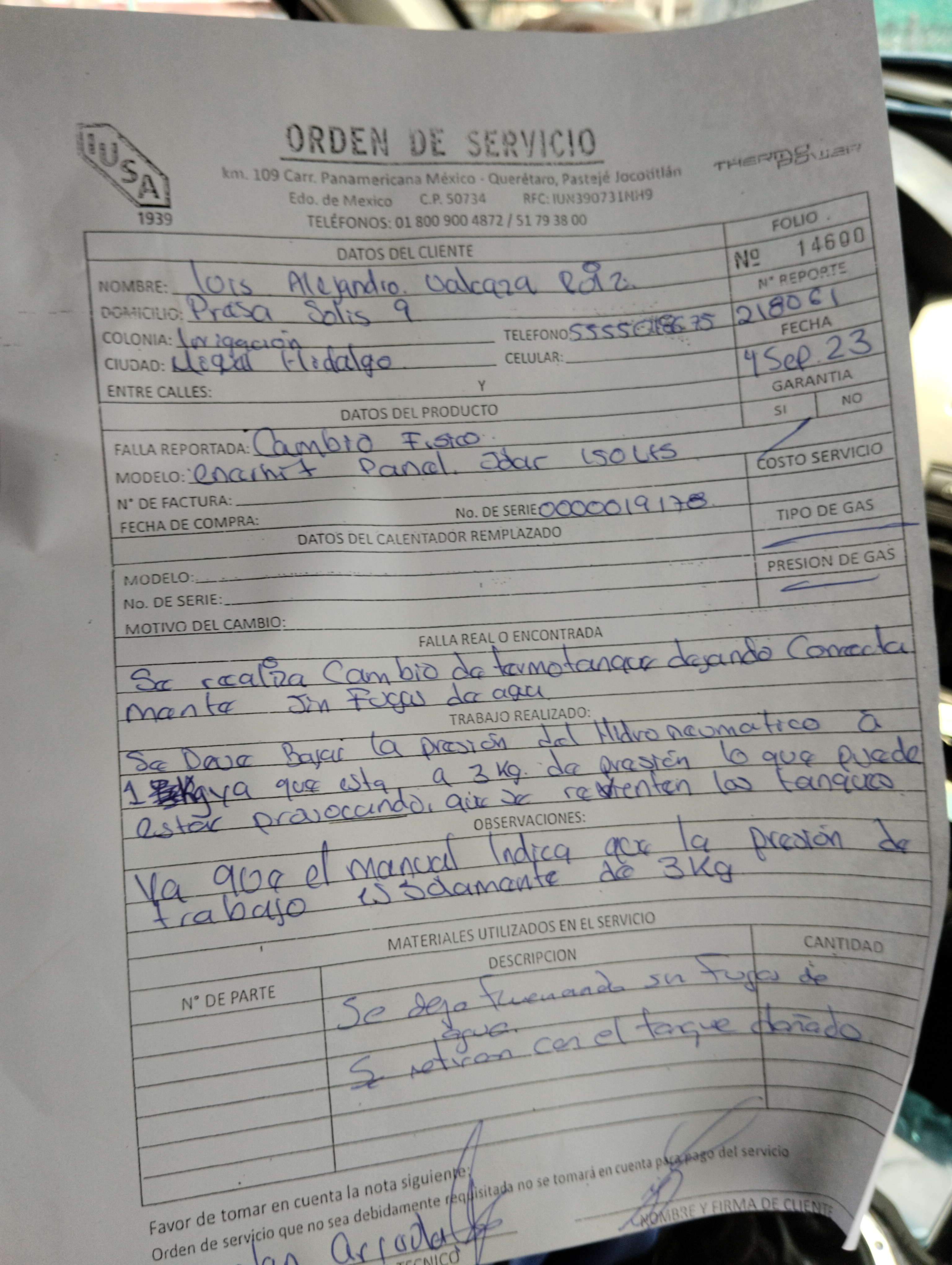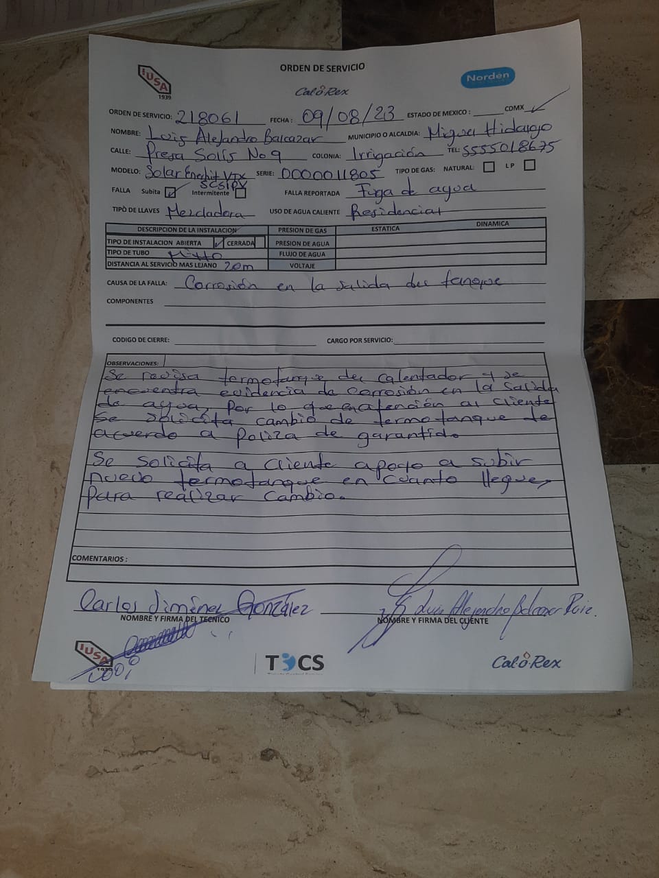| Orden Interna | 58011803/58012778 | Falla Real | Fuga de agua en termotanque | ||||||||||||||||