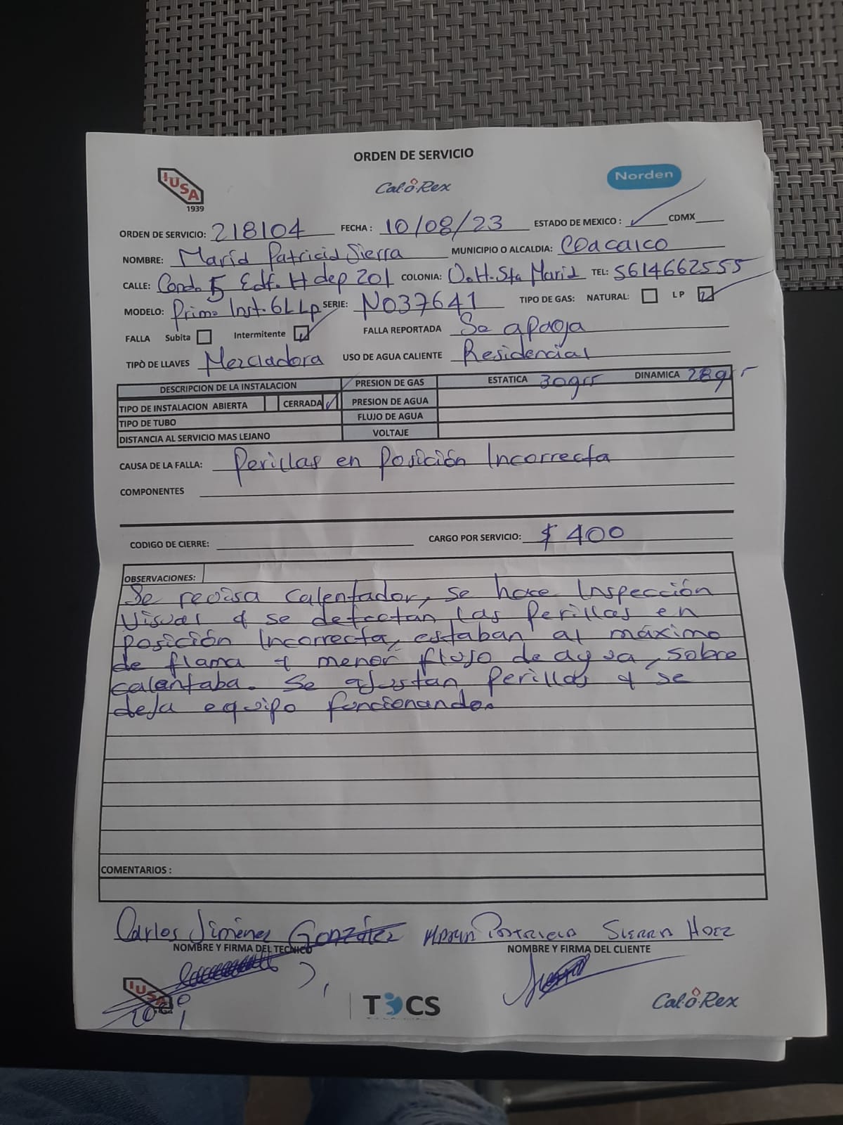 Usuario comenta que prende el calentador dura 20 segundos y se apaga, utiliza gas LP, la toma de agua es de tinaco, la base del tinaco mide 1.50 mts, el calentador esta al intemperie, las baterias son Alcalinas. |