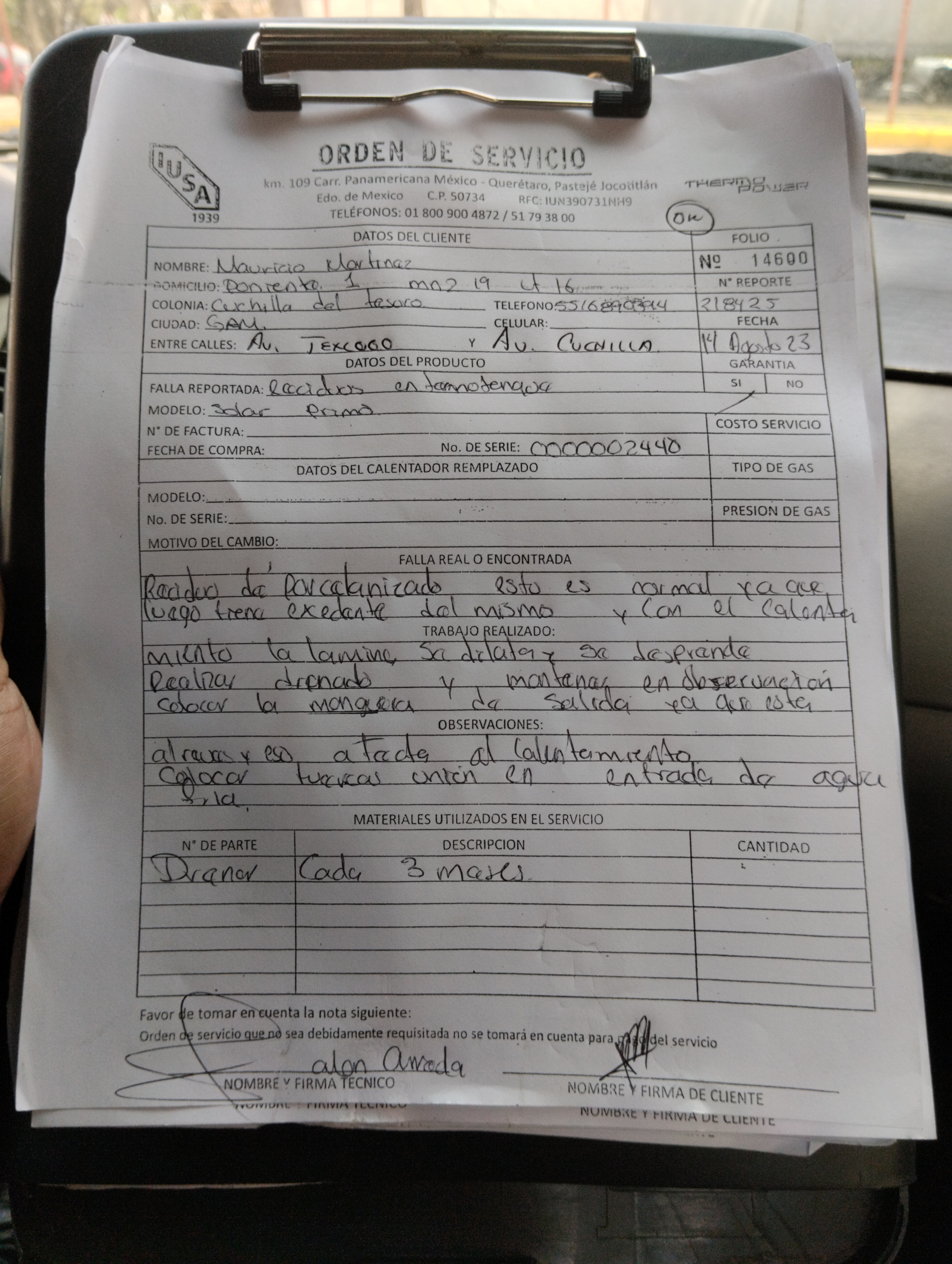 | Usuario reporta que su equipo saca pedazos negros, esto lo detecto desde que se genero el reporte TT217714 (en este el tecnico no detecto falla y cobro la visita) pero al momento de que el cst acudio no salieron estos pedazos. EL usuario quiere que se revise el equipo de nuevo ya le preocupa que de este deshaciendo el material de dentro del termotanque |