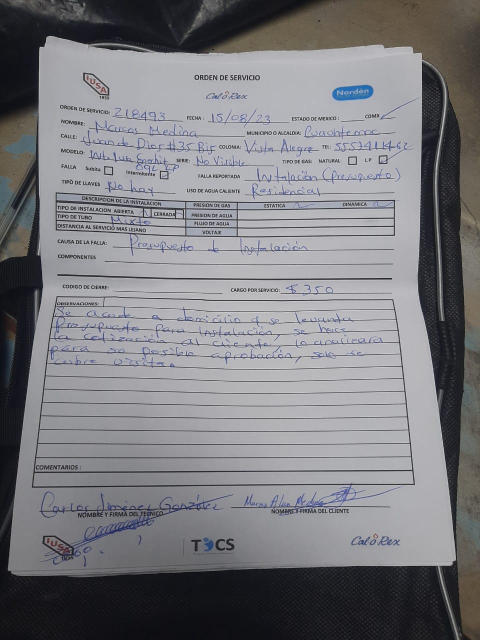 | Se comunica usuario solicitando un SERVICIO CON COSTO, para la instalacion de un calentador Enerhit |