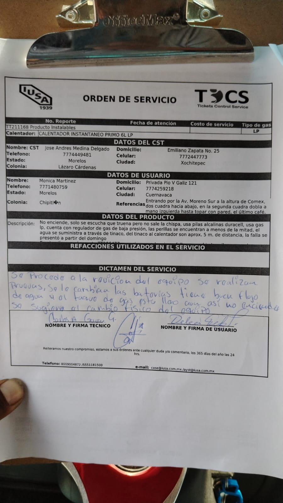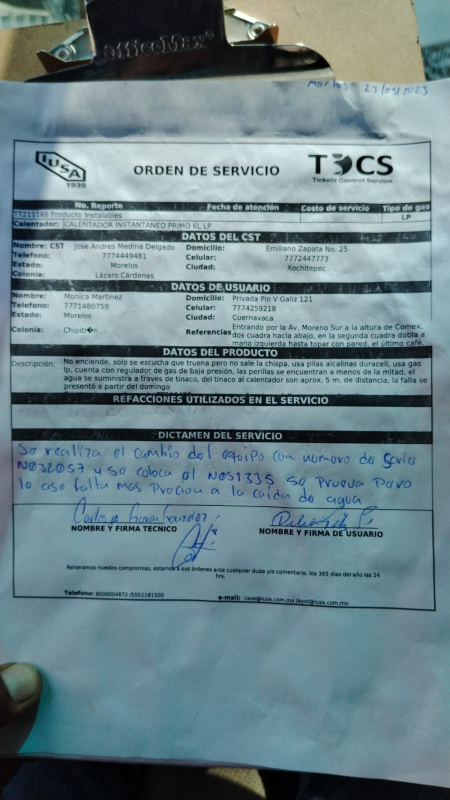 | Técnico | Jose Andres Medina Delgado | Fecha Asistencia | 2023-05-23 09:00:00 | ||||||||||||||||