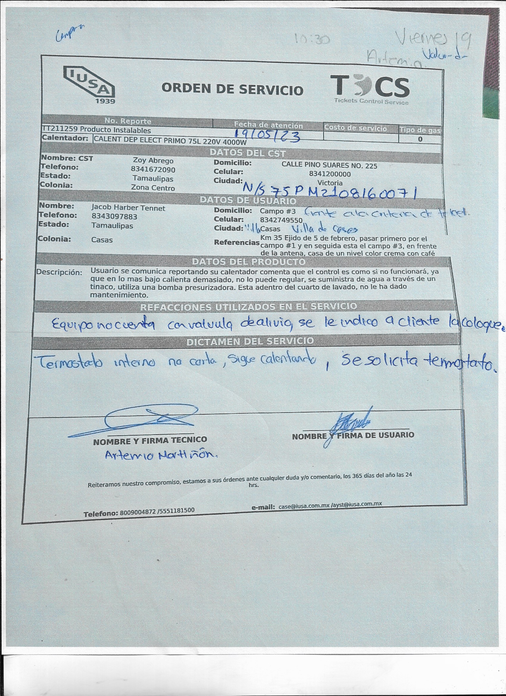 | Orden Interna | 56015691 | Falla Real | El termostato no funciona | ||||||||||||||||