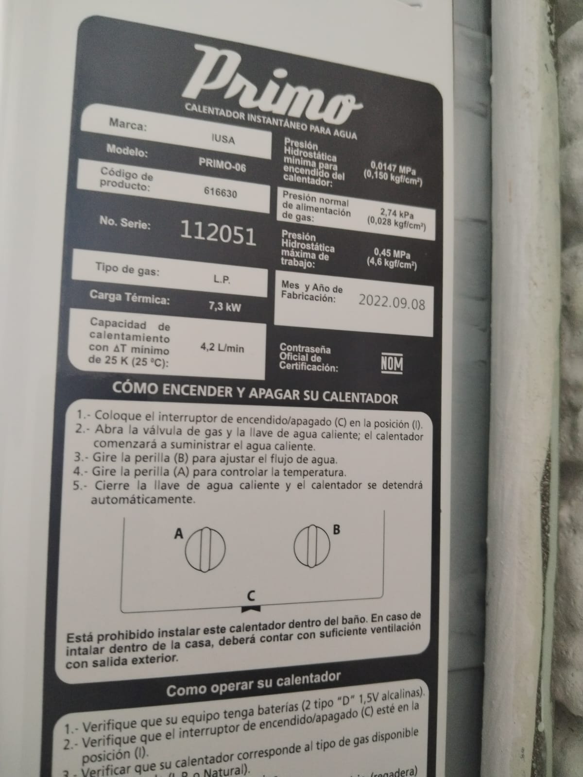 | Material | CALENTADOR INSTANTANEO PRIMO 6L LP | Tipo Producto | |
