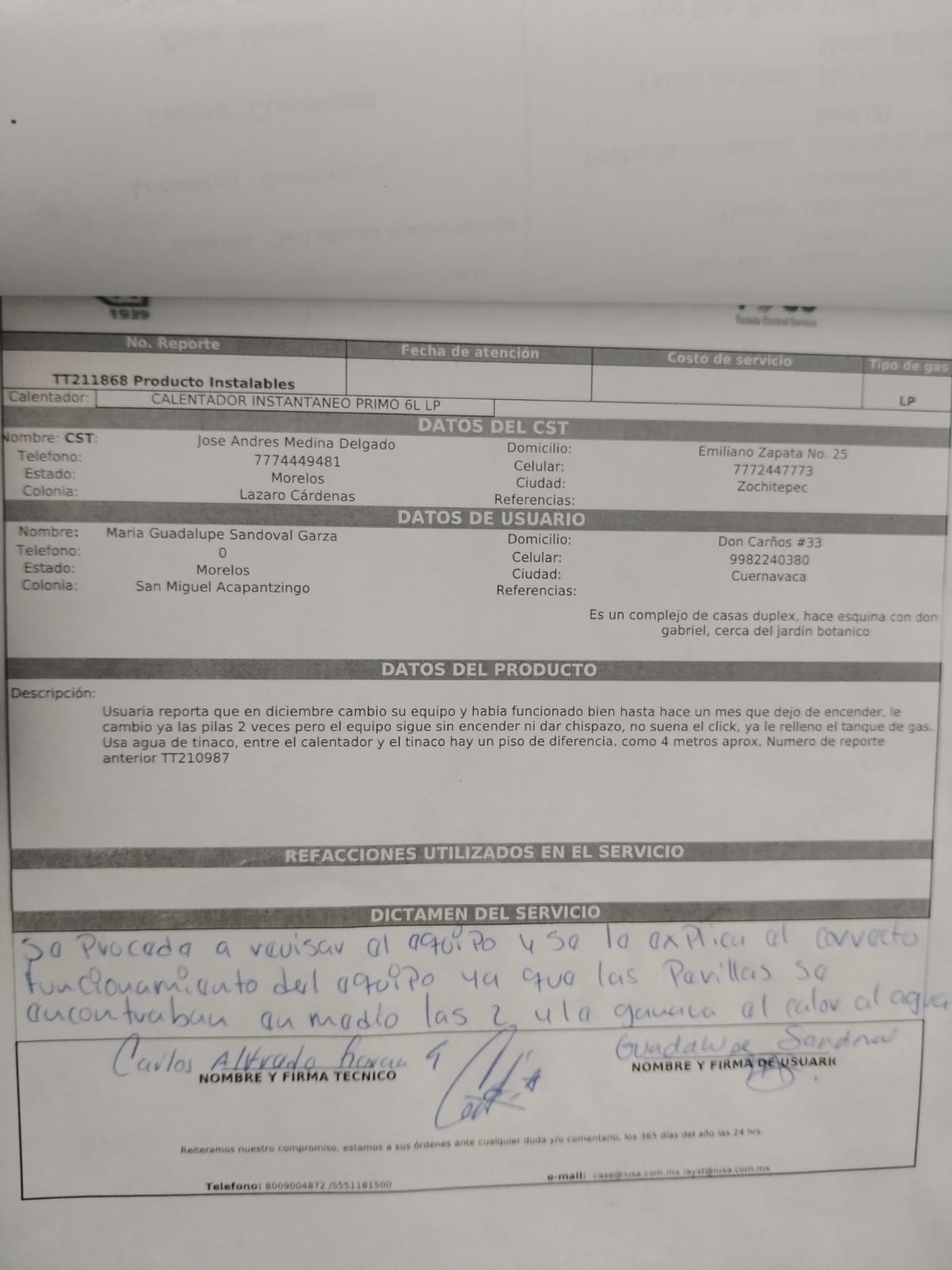 Usa agua de tinaco, entre el calentador y el tinaco hay un piso de diferencia. como 4 metros aprox. Numero de reporte anterior TT210987 |