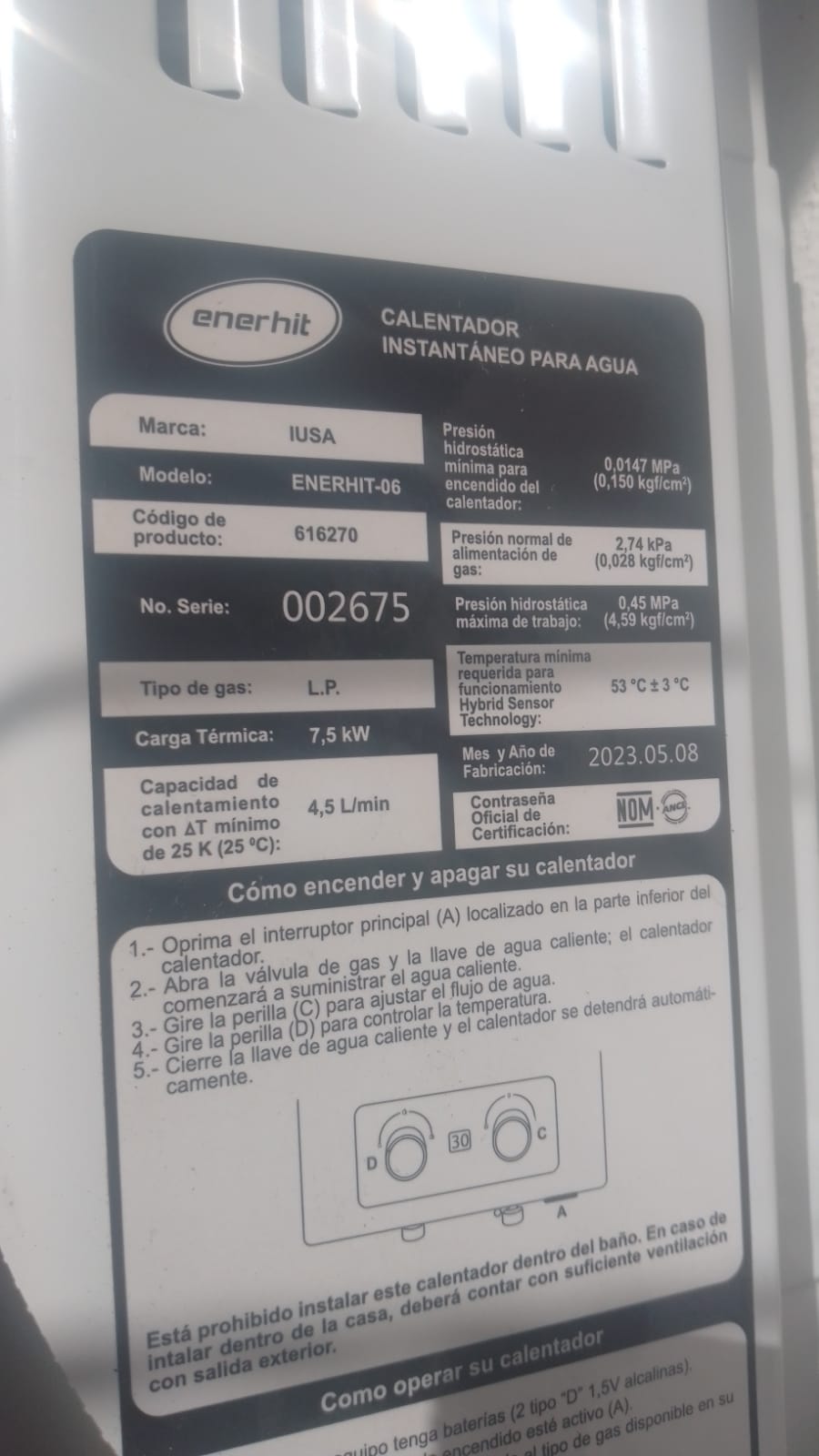 | Material | CALENTADOR INSTA IUSA ENERHIT 06L LP | Tipo Producto | |