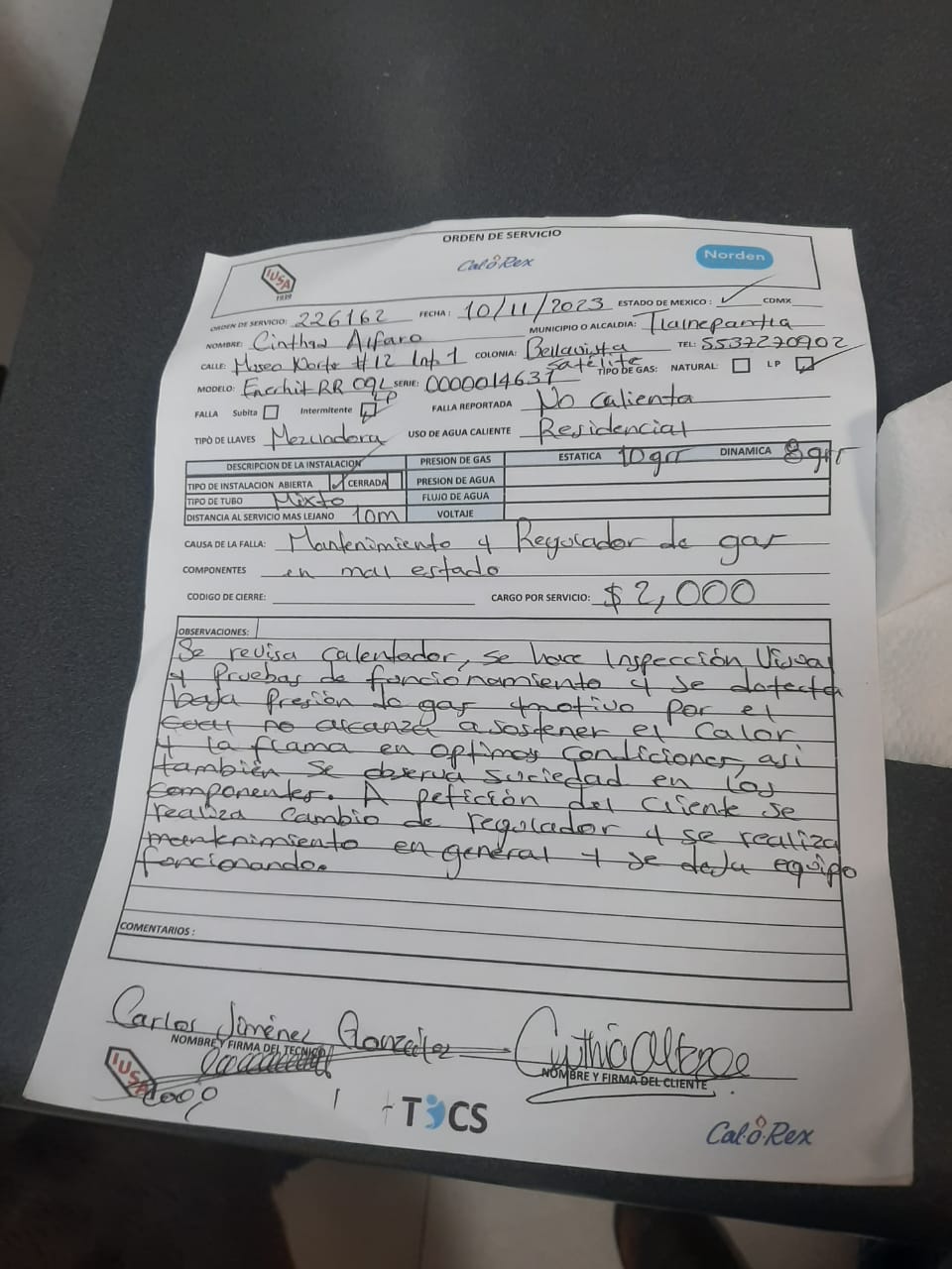 Además de esto no ha detectado otra falla. Usa gas LP, no sabe de que color es el regulador Servicio con costo. |